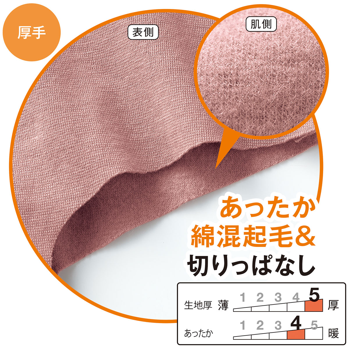 ふっくら厚手裏起毛肌側起毛で寒い冬でもふっくらあたたか。ふんわりとした厚みもあり、保温力も◎。