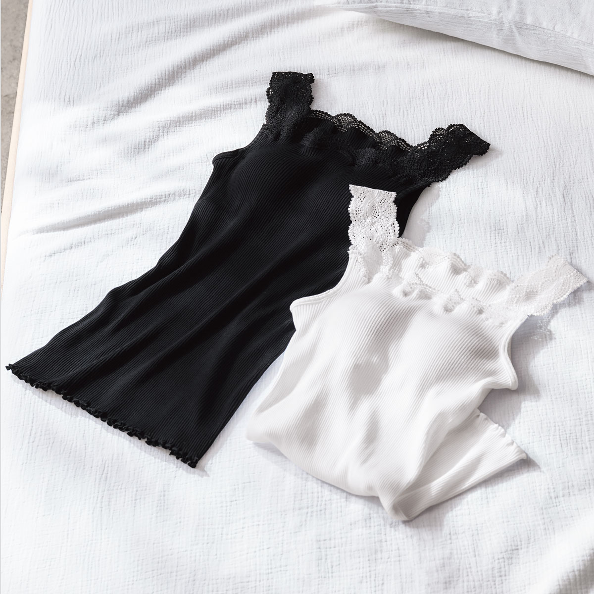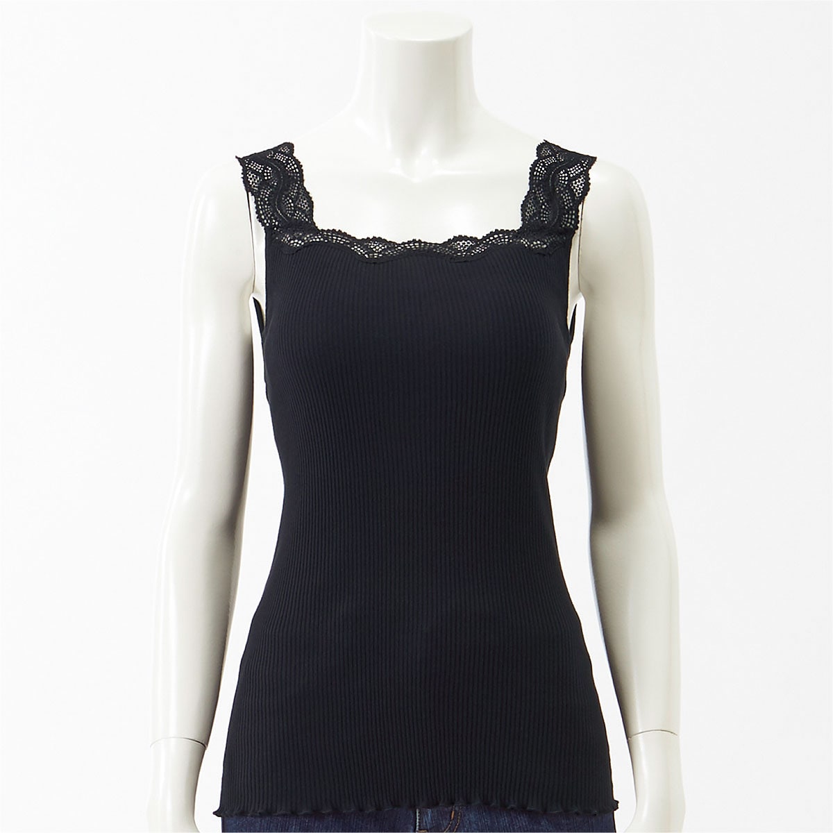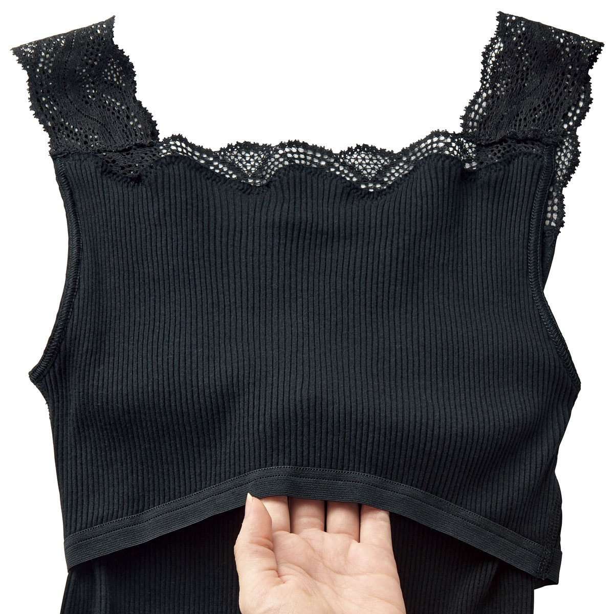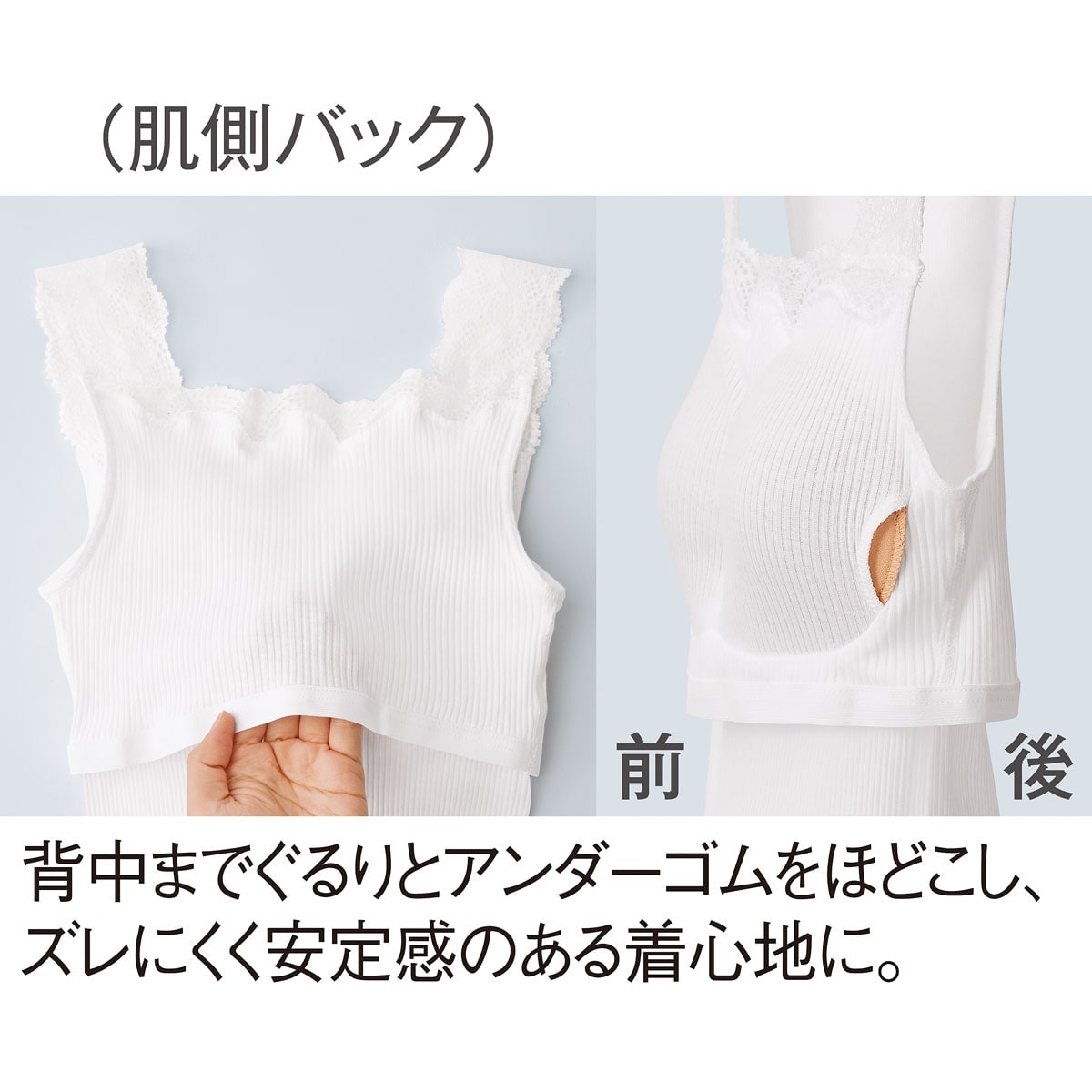 ■本体=綿100%(リブ)レース=ナイロン・ポリウレタン(ストレッチレース)▼取り外し可能なカップ型パッド付き(トップ厚約3.5mm)●中国製(レース:日本製)【綿100%】(本体)【カップ型パッド約3.5mm】(取り外し可)