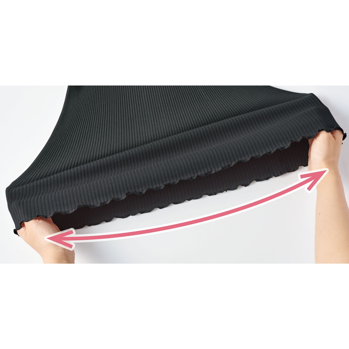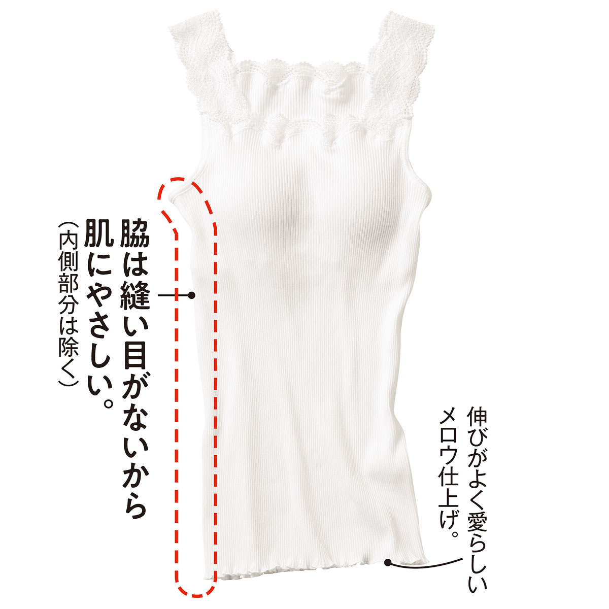 なめらかに肌になじむ、伸びのよい綿100%リブ素材のパッド付きインナー。薄手でのびやかにボディラインにフィットします。外側の身頃部分は脇に縫い目なしでゴロつきにくい。取り外し可能なパッド付きだから、ブラ無しでリラックスしたい時におススメです。裾は締め付けや縫い目を感じにくいメロウ始末で仕上げています。