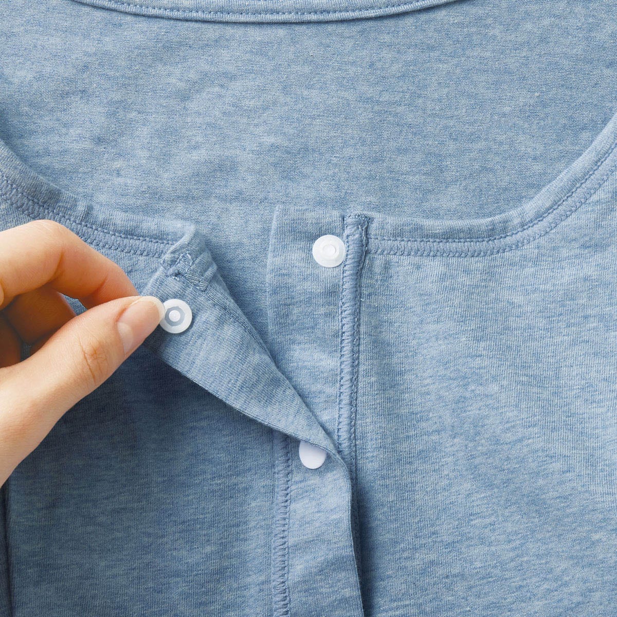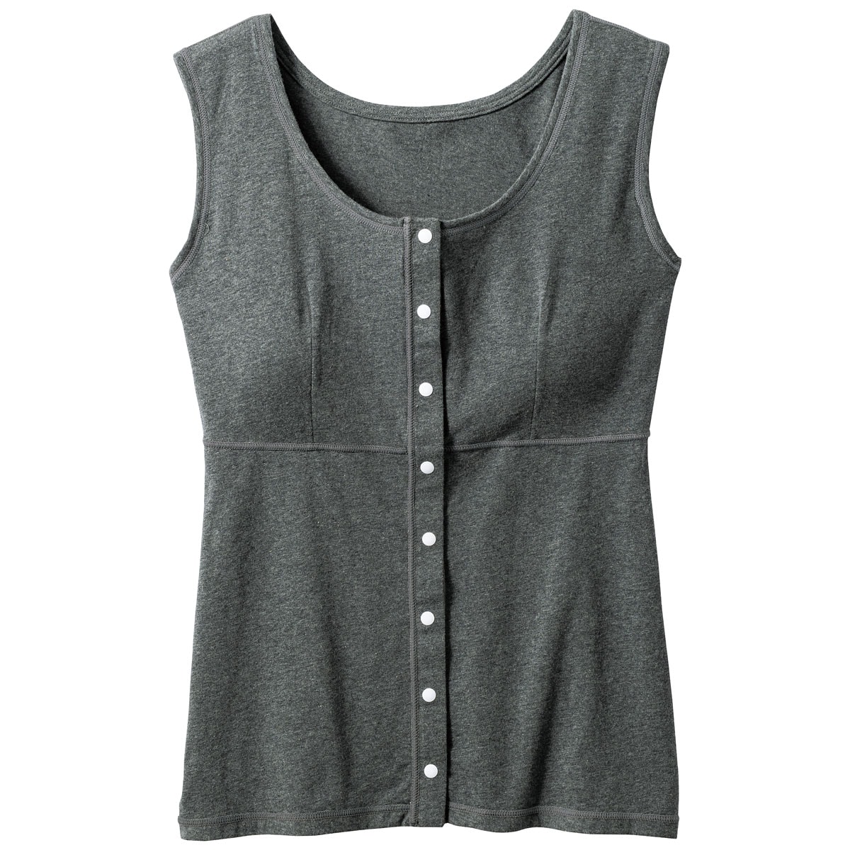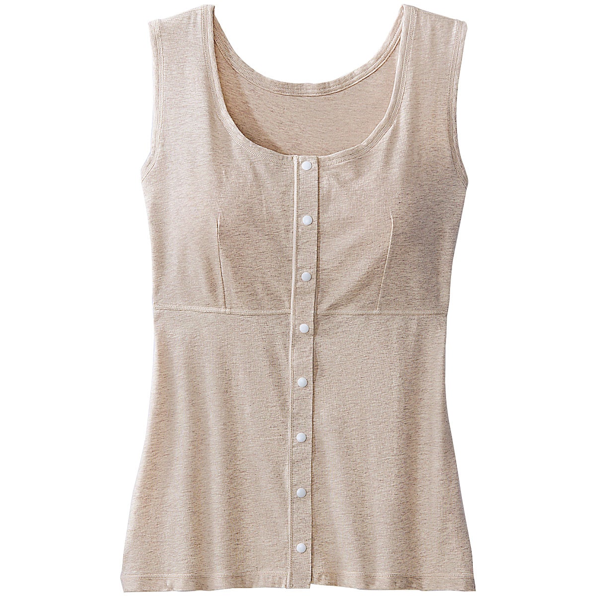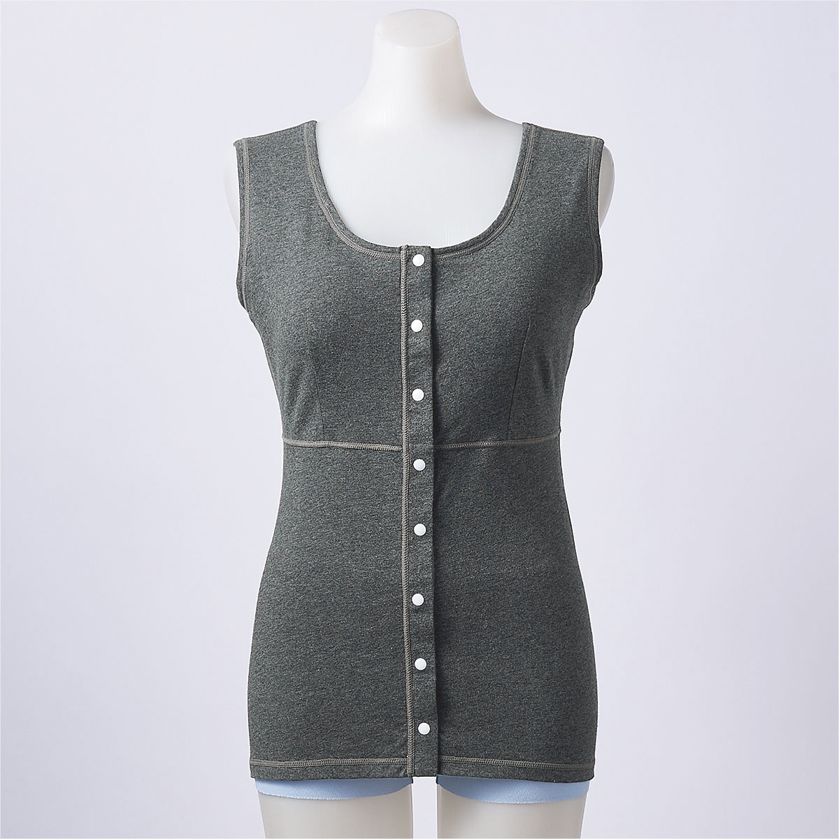 やわらかで伸びのよい綿95%の綿混ストレッチ天竺を使用。脱ぎ着が簡単なスナップボタンの前開き仕様で、取り外し可能なパッド付きのスリーブレスインナーです。通院時やおやすみ時のトップスとしても重宝します。脇や裾などの縫い代を外側にすることで、肌に優しく縫い目のゴロつき感も軽減。洗濯表示はプリントにしてストレスのない着心地に仕上げています。大きいサイズも展開しています。