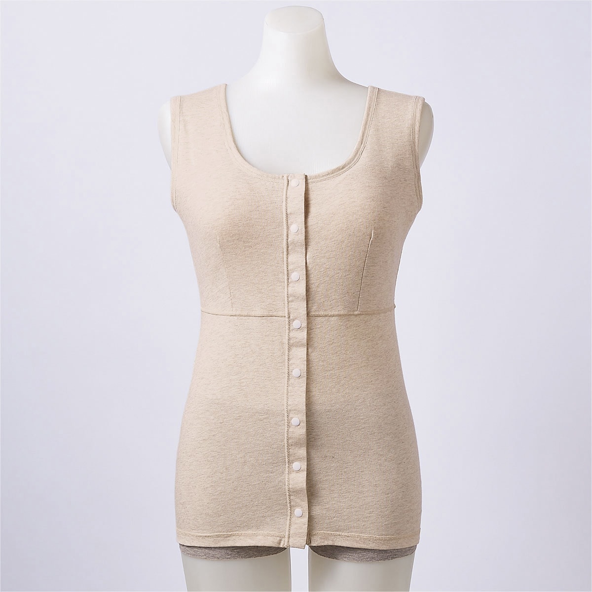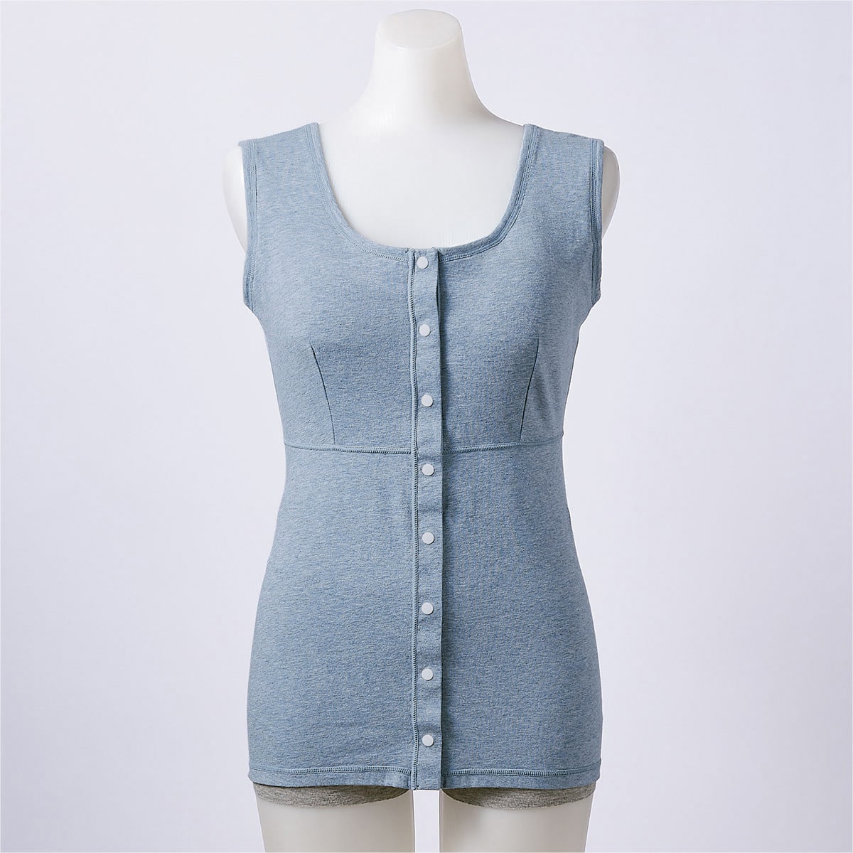 リラックス&おやすみの時にも快適♪スナップボタンの前開きで脱ぎ着がしやすいインナー。綿混ストレッチ&スリーブレスで長い季節活躍します。