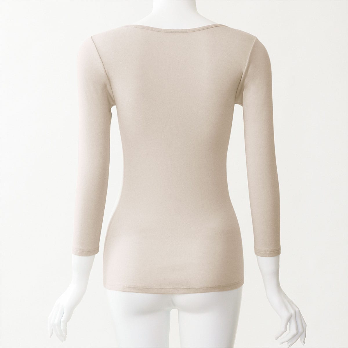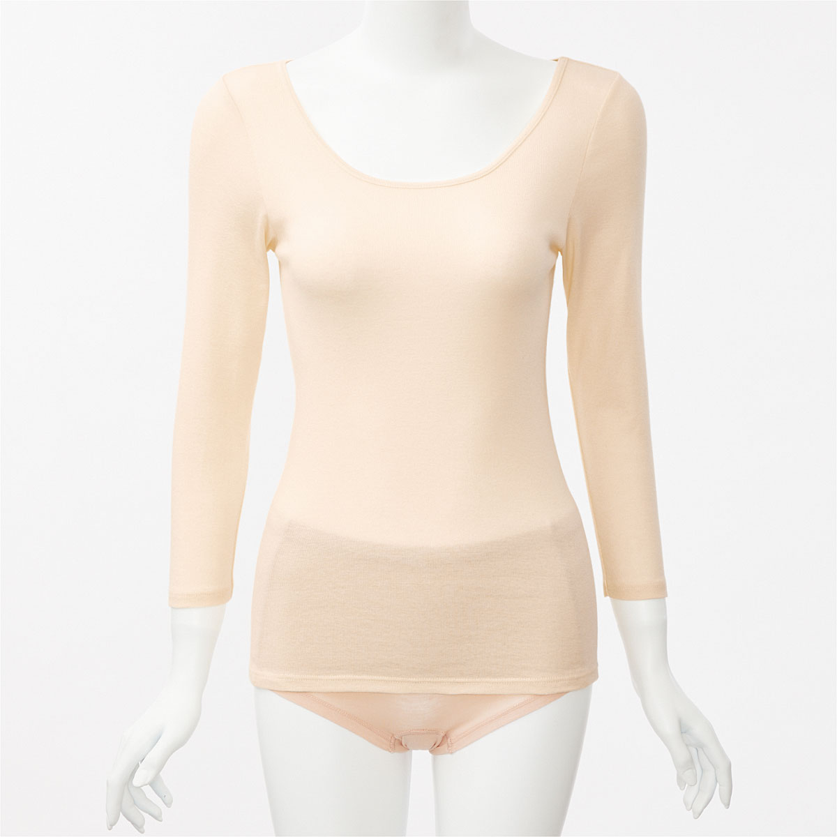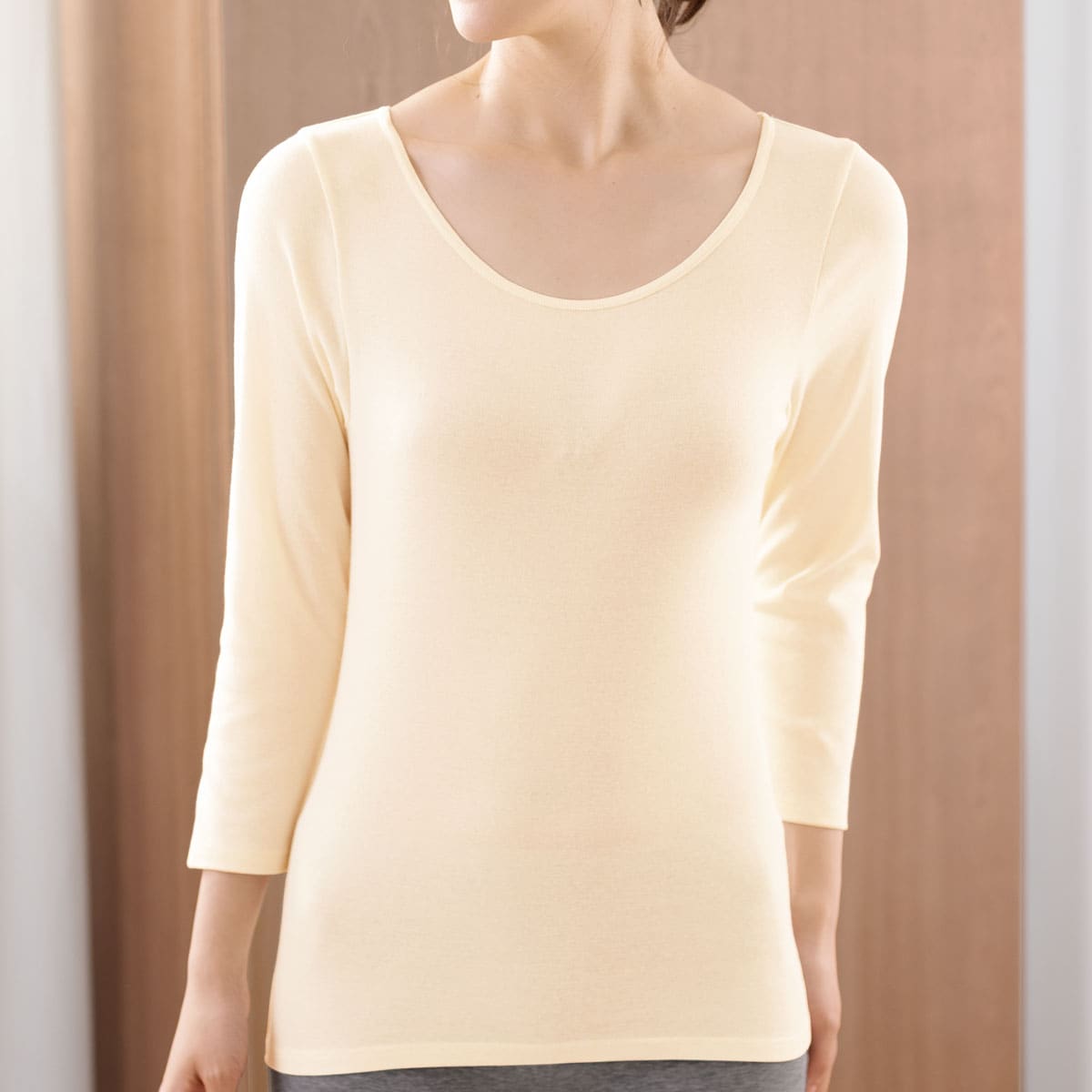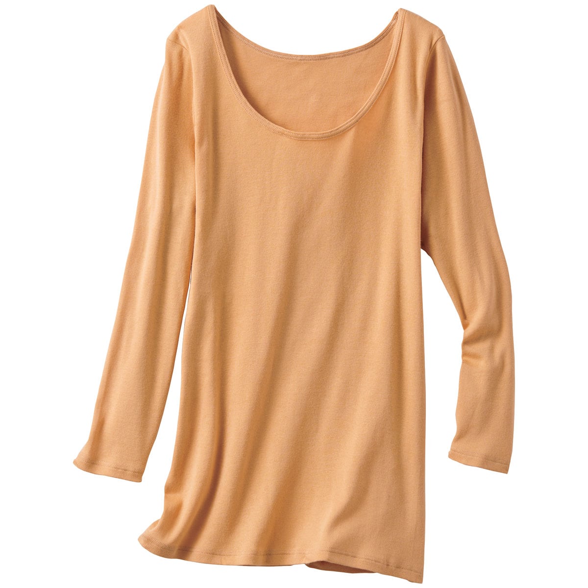 • 脇に縫い目のないコットン100%8分袖(ラウンドネック) | アプリコット
