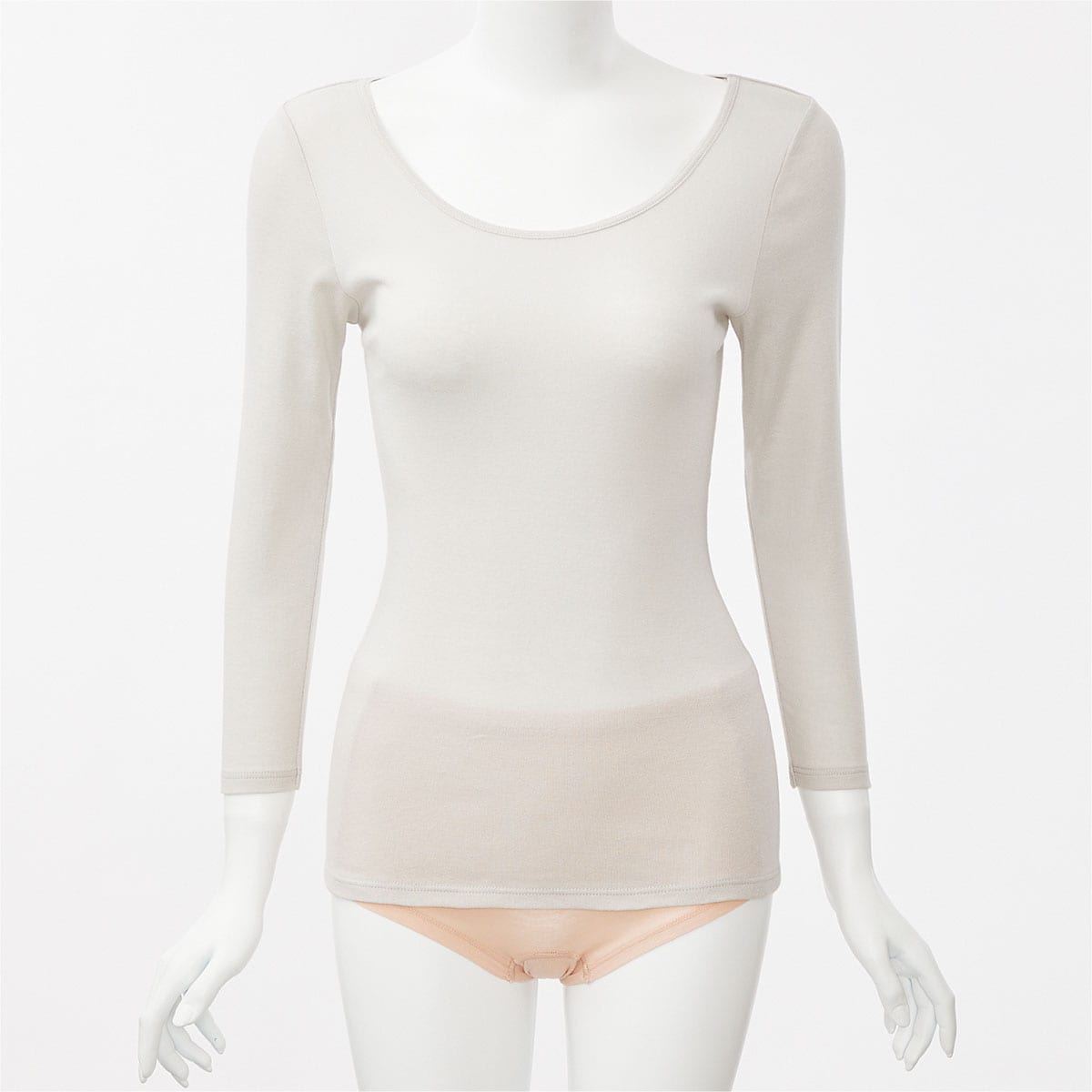 インド綿を使ったやさしい伸縮性のフライス編み素材と、脇に縫い目がないすっきりとした着心地が魅力の綿100%8分袖インナー