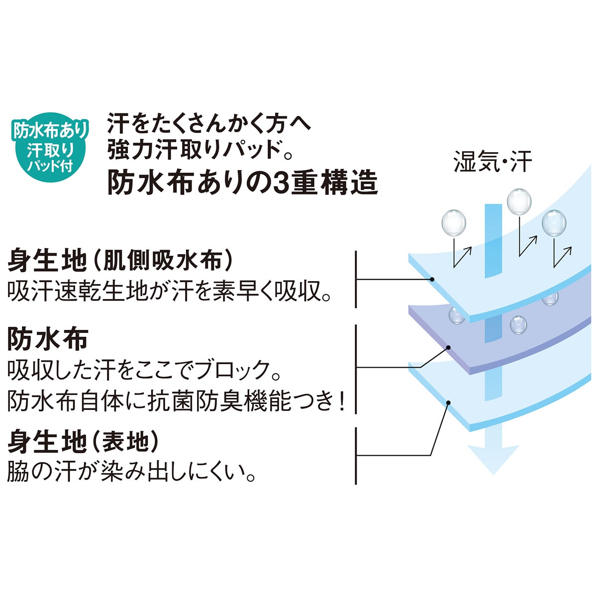 汗をたくさんかく方へ強力汗取りパッド。防水布ありの3重構造 (1)身生地(肌側吸水布) 吸汗速乾生地が汗を素早く吸収。 (2)防水布 吸収した汗をここでブロック。防水布自体に抗菌防臭機能つき! (3)身生地(表地) 脇の汗が染み出しにくい。