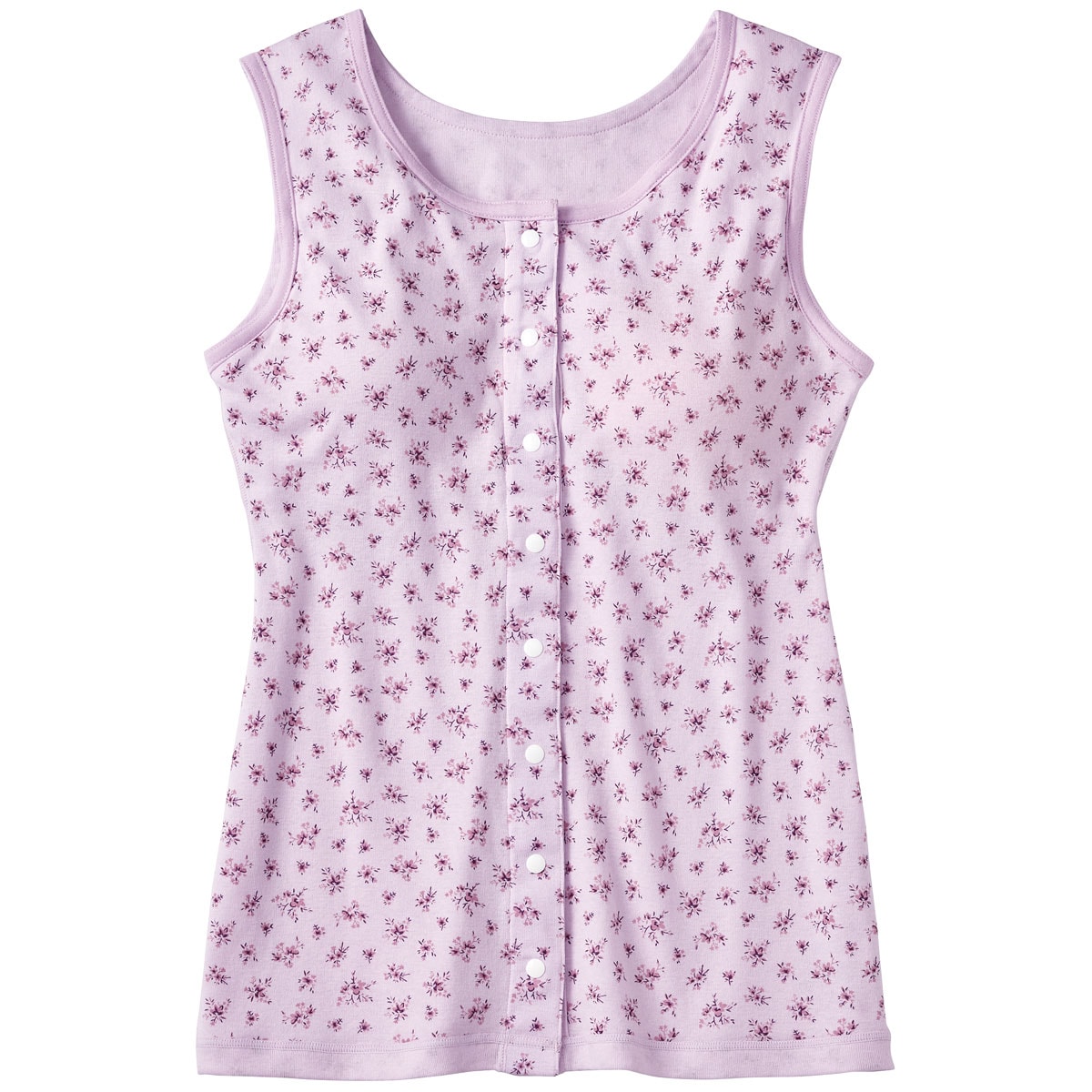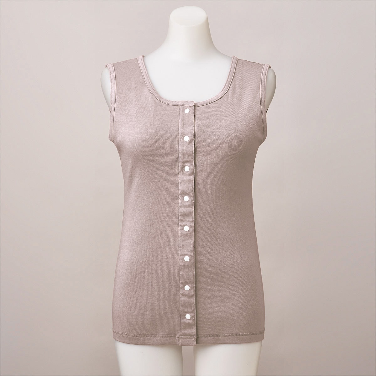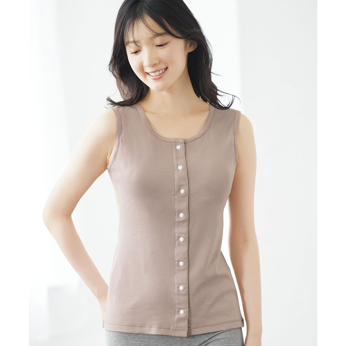 肌に優しい仕様にこだわった、スナップボタンでフロントが全開する前開きタイプの綿100%パッド付きスリーブレス