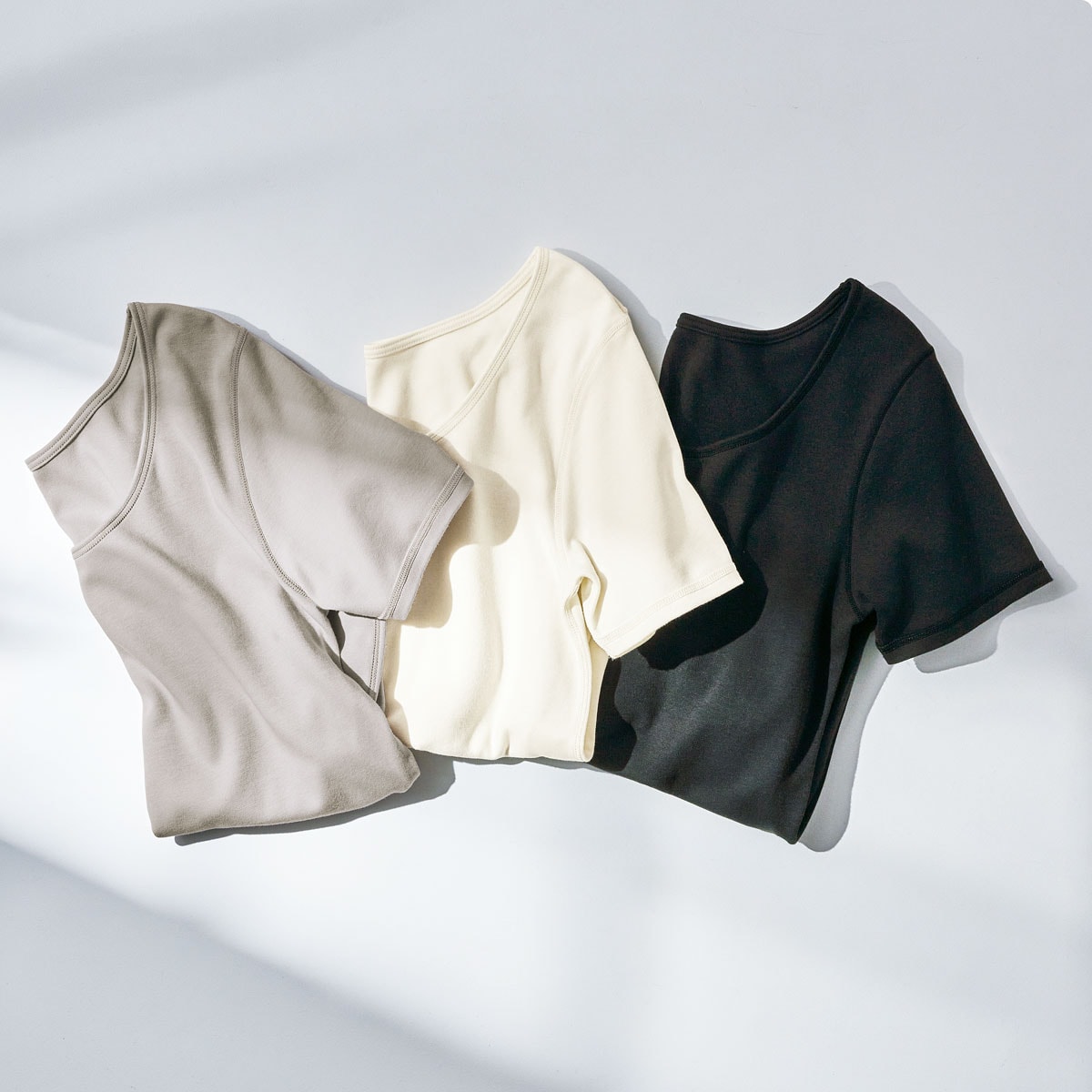 (肌側 サイド・袖口・裾)縫い代が気になる方にもおすすめ 縫い代はすべて表に出すことで、肌に当たる部分をとことんなめらかに仕上げました。(写真は、同シリーズのUE-1697です)
