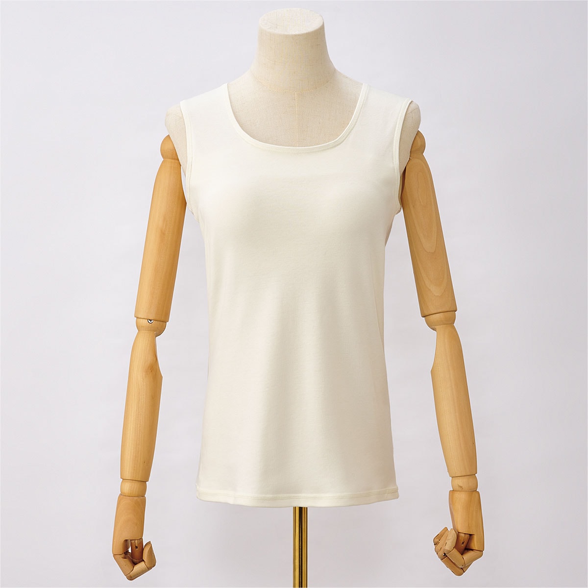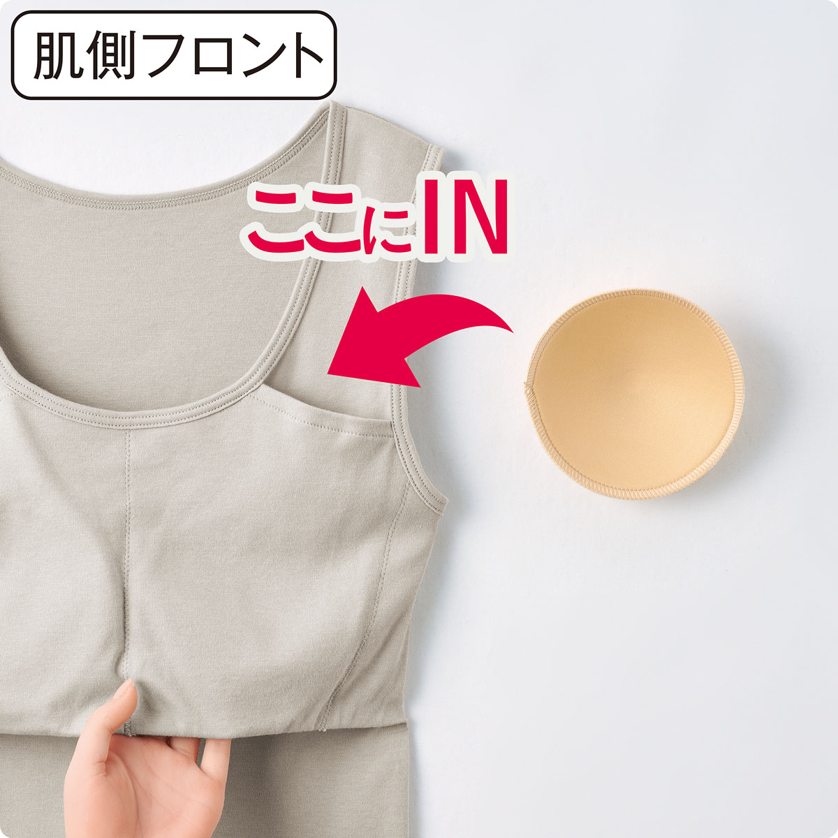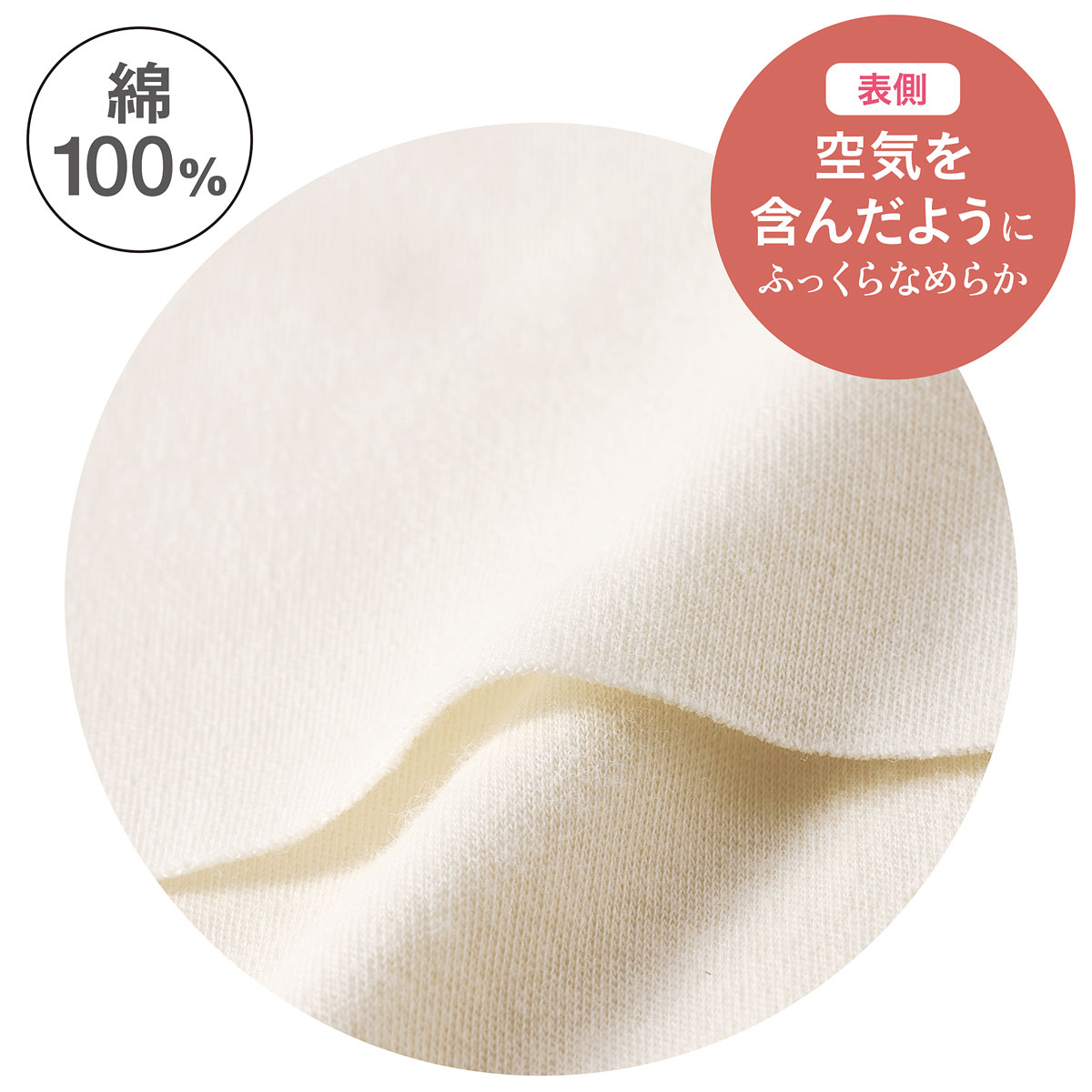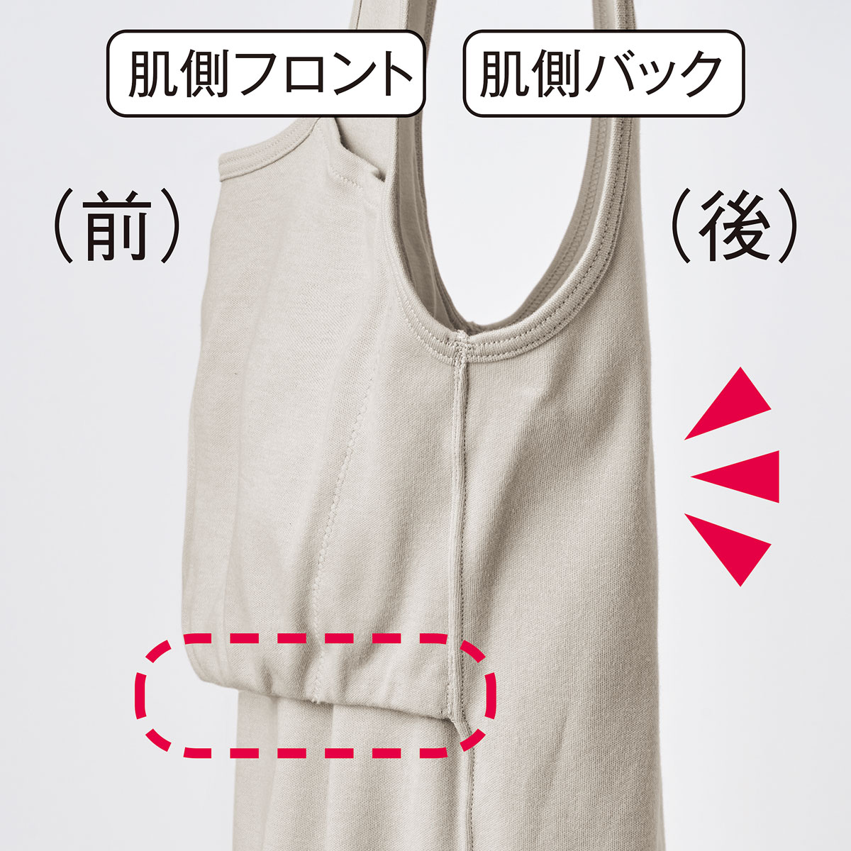 空気を含んだようにふわっとやわらかな肌ざわり。綿100%なのに、体から発散される水分を吸着して発熱する吸湿発熱機能でやさしいぬくもり感もあります。気になる縫い代を全て外側にし、肌側には縫い代を無くしたこだわりの縫製仕様。チクチクして気になることもある取扱い表示もプリントにしています。デリケートなお肌の方にも、お試しいただきたいアイテムです。取り外し可能なパッド付きのノースリーブは、アンダーゴムが肌に当たらない優しい仕様と、背中にゴムが無いラクな着心地が魅力。