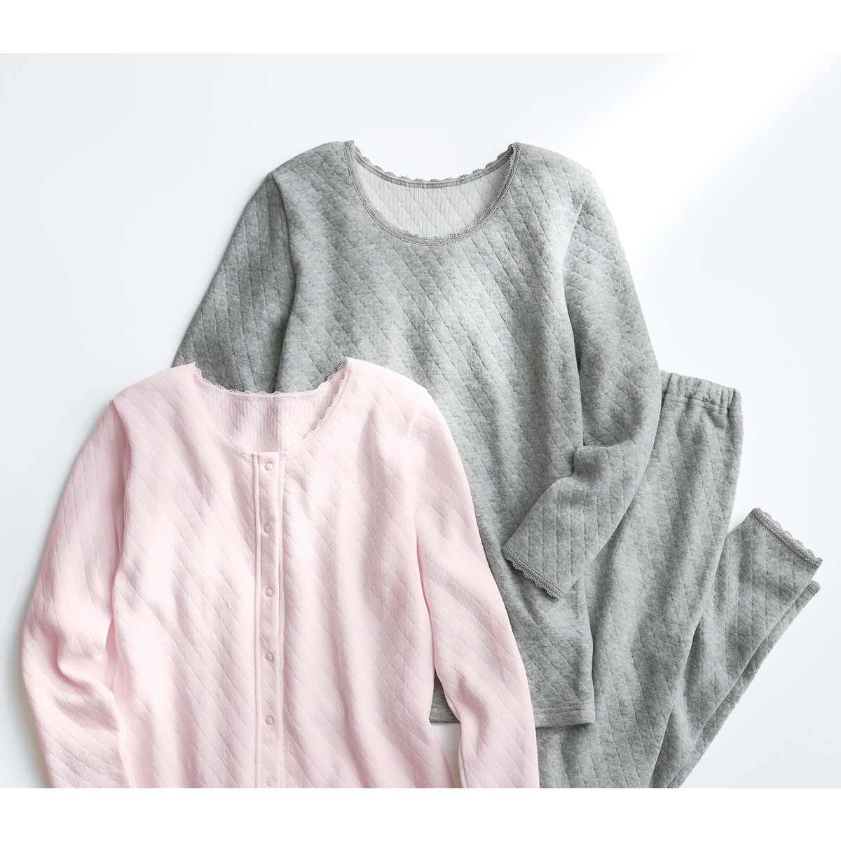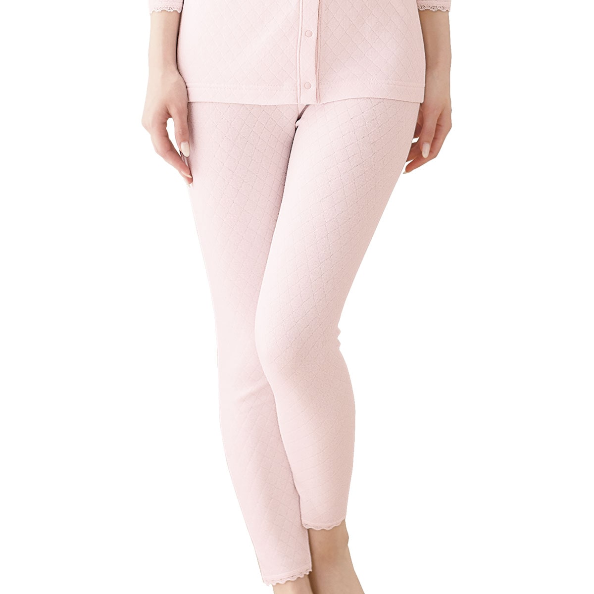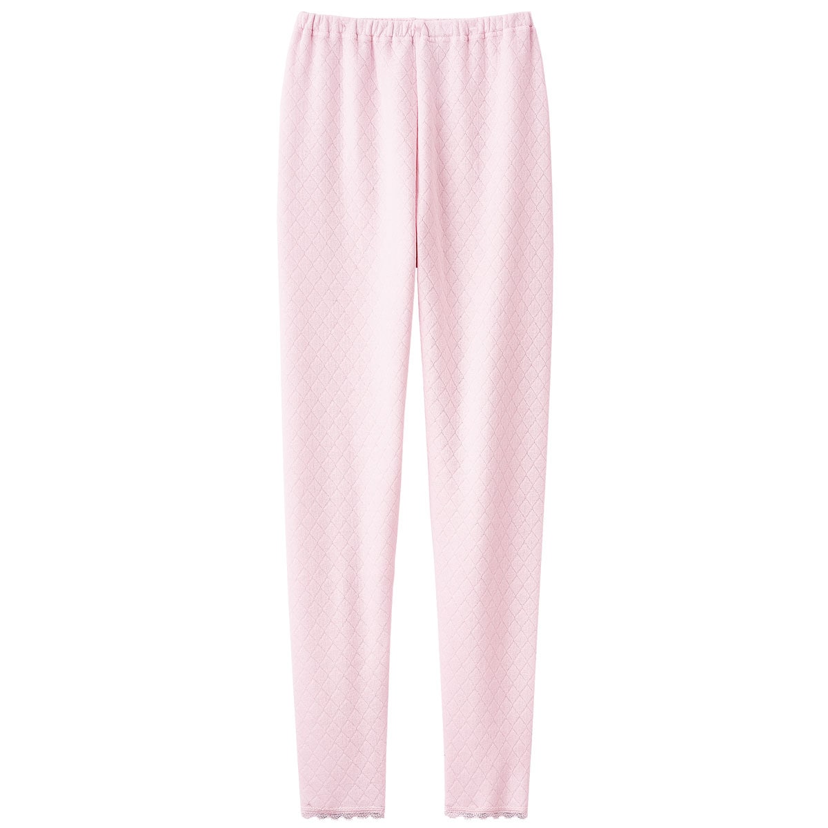 綿100%素材でふわふわの中わたをサンド。体温で温められた空気が生地の間にため込まれることで生まれるやさしいぬくもり感が心地いい、冬のあったかインナーです。オーソドックスなダイヤ柄キルトのしっかり厚みのある生地で、綿素材の柔らかな肌触りもポイント。足口には細巾のストレッチレースをあしらったあたたかな10分長です。ウエストゴムは身生地でくるんだ肌に当たらない仕様で、ゴムの取替口があるのもうれしい。