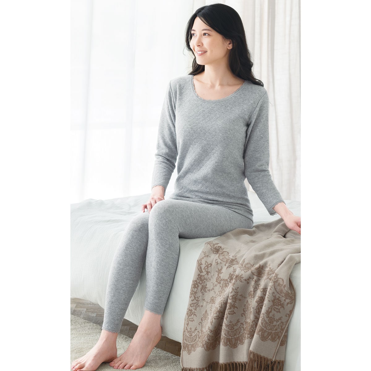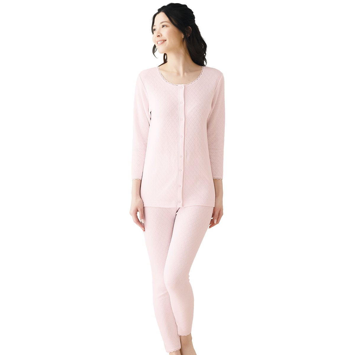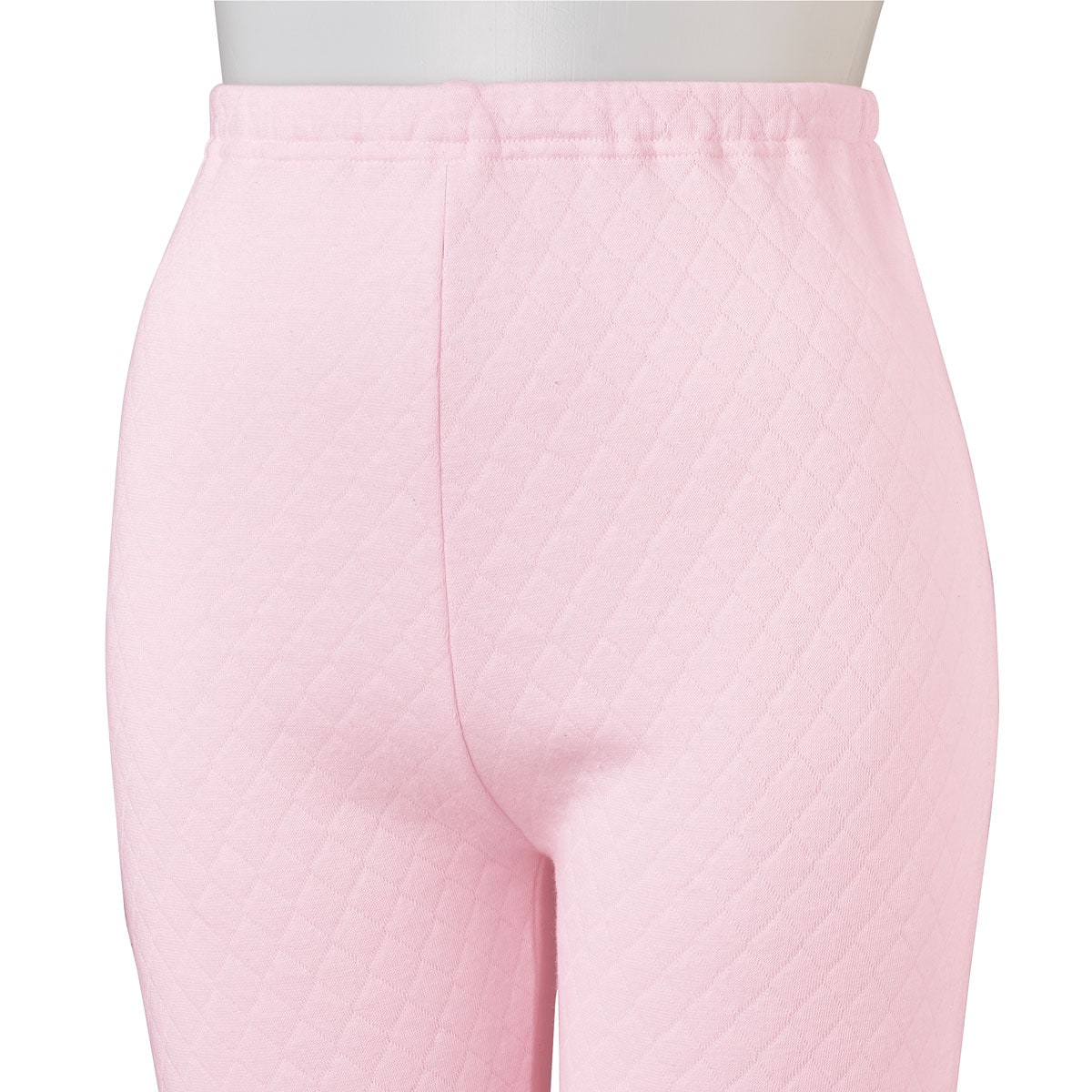 綿100%素材でふわふわの中わたをサンド。体温で温められた空気が生地の間にため込まれることで生まれるやさしいぬくもり感が心地いい、冬のあったかインナーです。オーソドックスなダイヤ柄キルトのしっかり厚みのある生地で、綿素材の柔らかな肌触りもポイント。足口には細巾のストレッチレースをあしらったあたたかな10分長です。ウエストゴムは身生地でくるんだ肌に当たらない仕様で、ゴムの取替口があるのもうれしい。