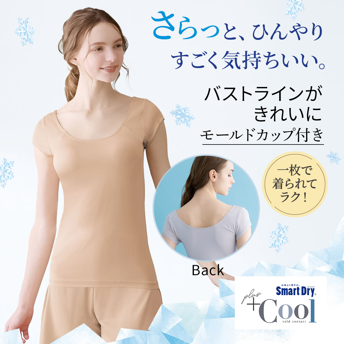 【Smart Dry® plus Cool】さらっと、ひんやり、気持ちいい。広めの衿開きとカップ付きで、1枚で着られて便利でラク。接触冷感や吸汗・速乾など、夏にうれしい快適機能満載のインナー