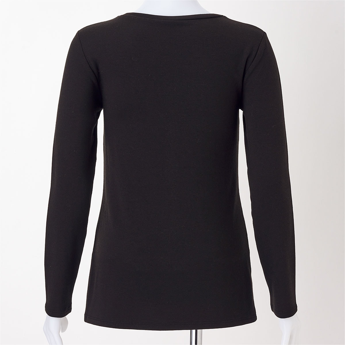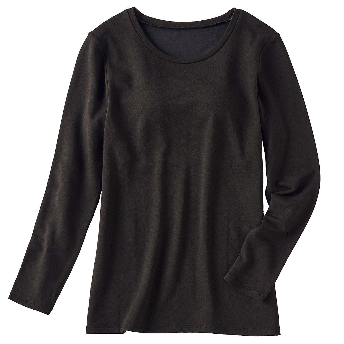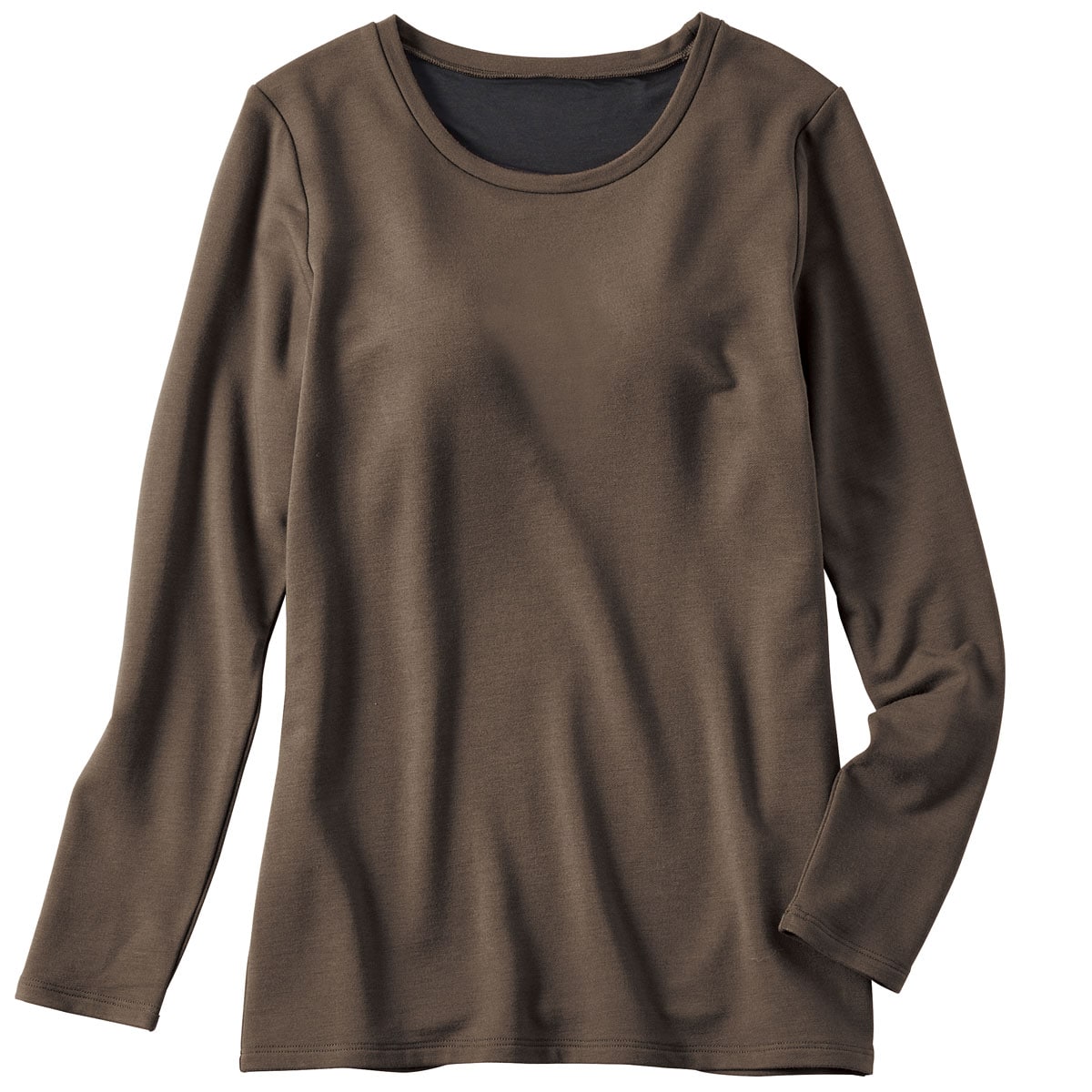 特に寒い日や、真冬のお出かけ時にお勧め。吸湿発熱機能を持ち、肌側を起毛させた厚地で暖かなインナー。ブラカップが付いてTシャツ感覚で着れる10分袖。1枚で暖かさもラクさも叶えます。