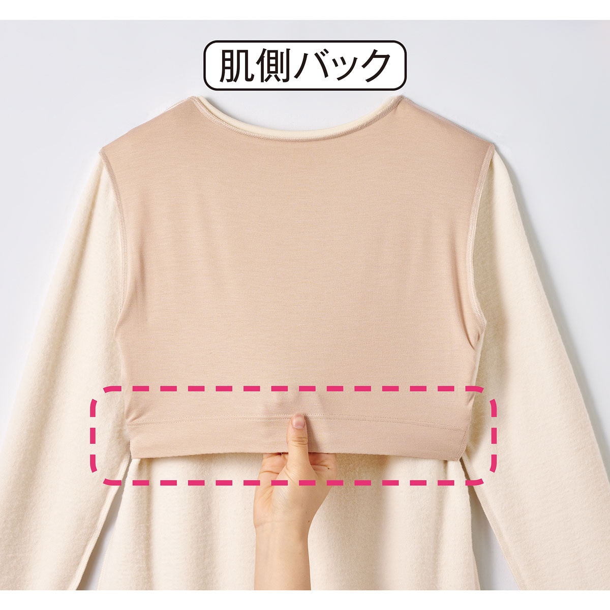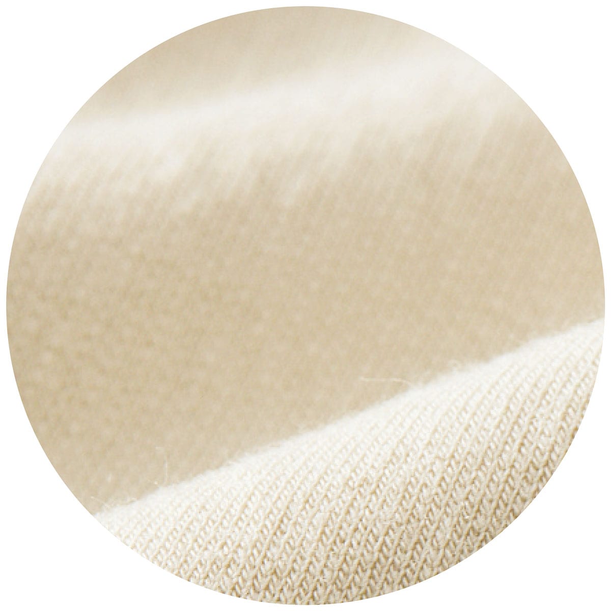 肌側起毛の厚手素材 表側はつるりとしてなめらか。肌側は、 空気の層をつくってあたたかさを逃さない!甘撚り綿を使用したこだわりの肌触り ※カップまわりの生地は肌側綿ではありません。