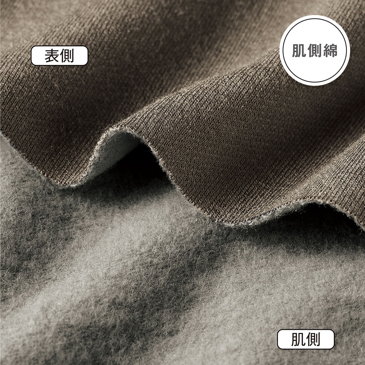 肌側起毛の厚手素材 表側はつるりとしてなめらか。肌側は、空気の層をつくってあたたかさを逃さない!甘撚り綿を使用したこだわりの肌触り。