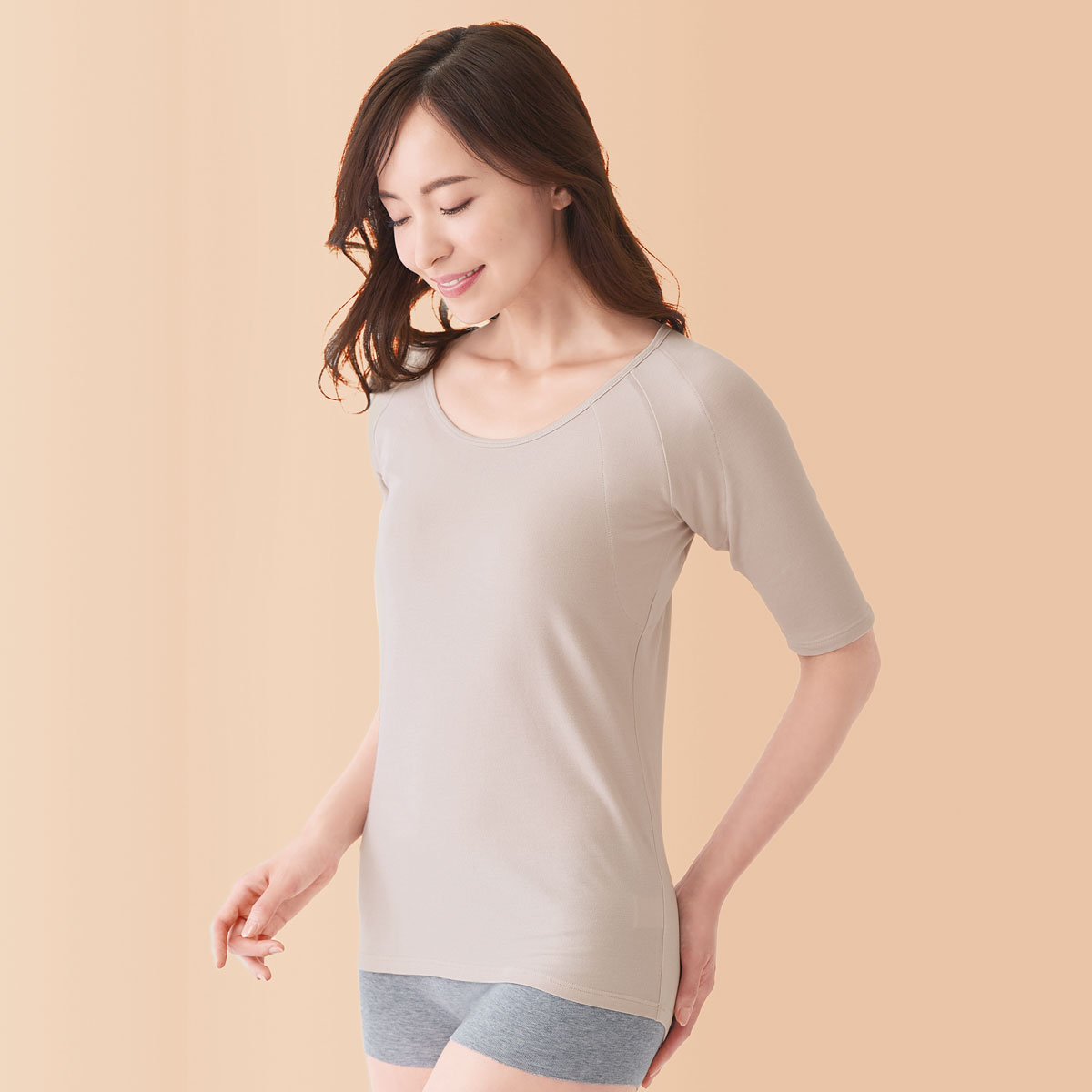 寒くても脇汗をかく方へ、薄手あったか綿混素材の汗取りパッド付き5分袖。