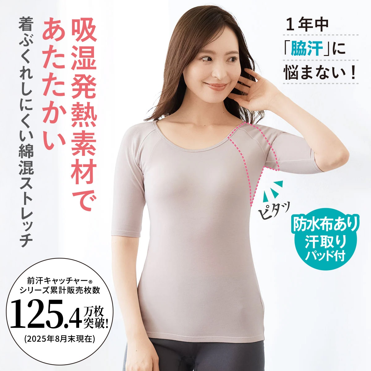 【前汗キャッチャー®シリーズ累計販売枚数125.4万枚突破!(2025年8月末現在)】寒くても脇汗をかく方へ、薄手あったか綿混素材の汗取りパッド付き5分袖