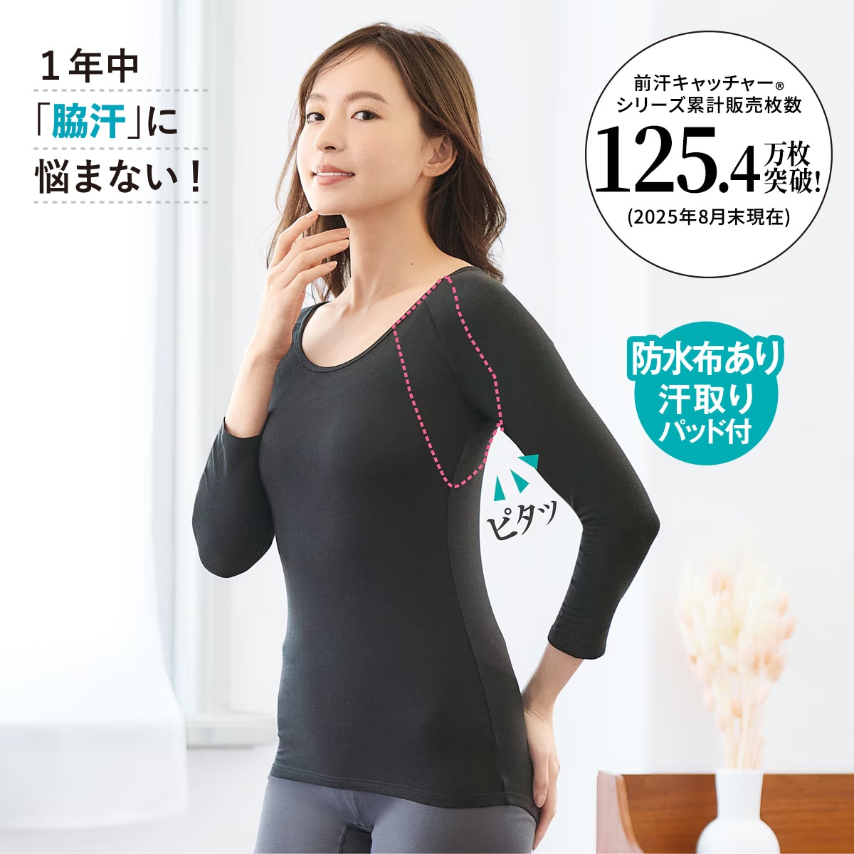 【前汗キャッチャー®シリーズ累計販売枚数119.8万枚突破!(2024年6月現在)】寒くても脇汗をかく方へ、薄手あったか綿混素材の汗取りパッド付き8分袖