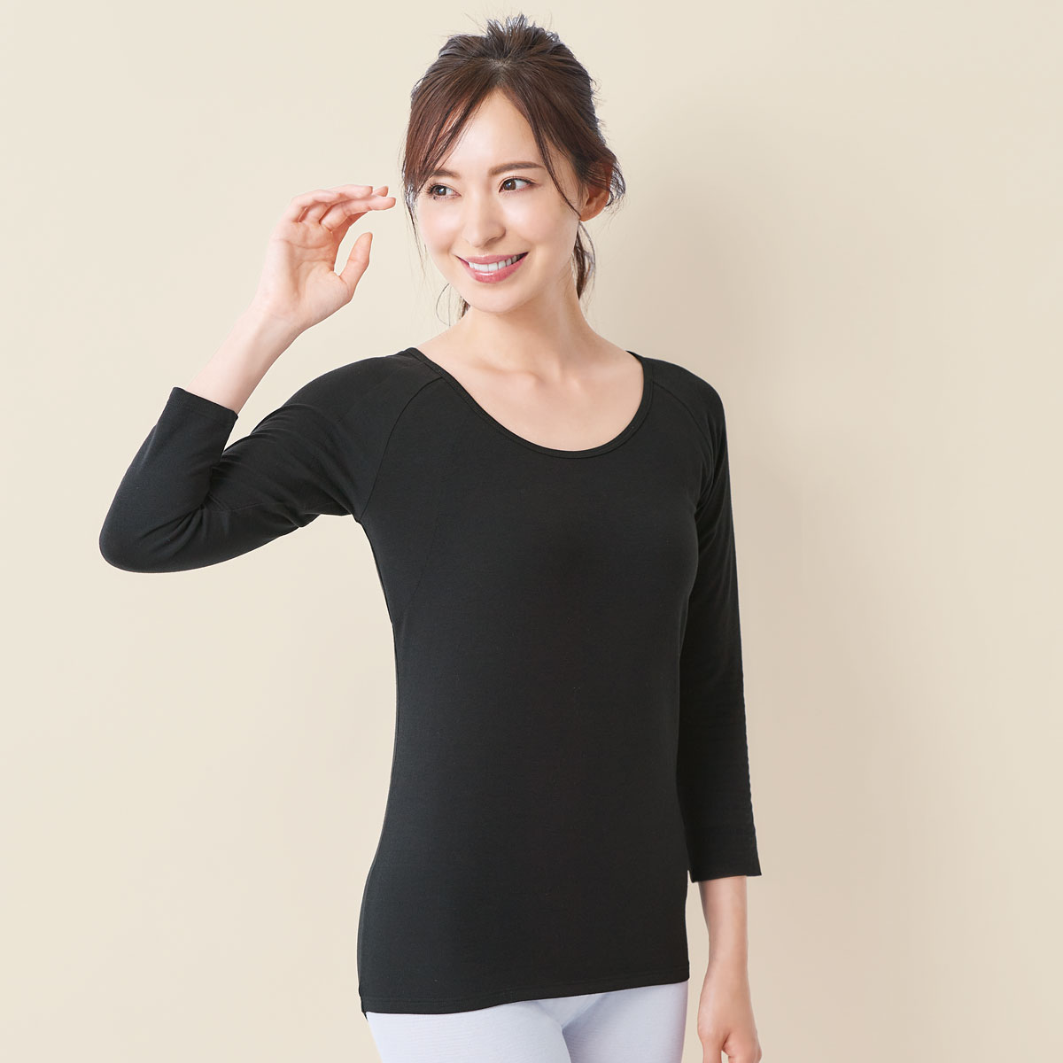 吸湿発熱素材 吸湿発熱素材であたたかく、吸汗機能もあり、着心地快適。ボディにやさしくフィットする薄手ストレッチ素材なので、着ぶくれしにくい!