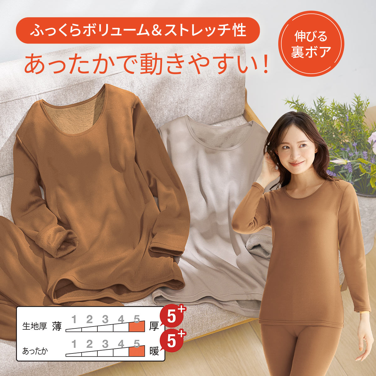 肌側は、まるで毛布みたいにあったかいボアがたっぷりで、ふわふわヌクヌク。表側はアウターのすべりが良い滑らかな肌触りでとっても柔らか。厚地なのによく伸びるから、アウターを重ねても動きやすくて快適!衿ぐりが狭めだから、首から入る風も軽減できて、寒い日の外出も安心。このインナーで、寒い冬を快適にお過ごしください。