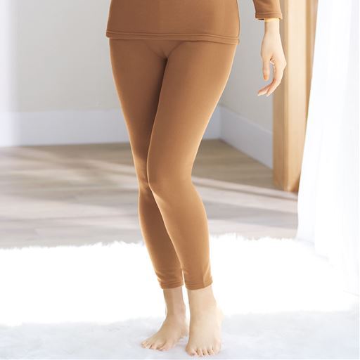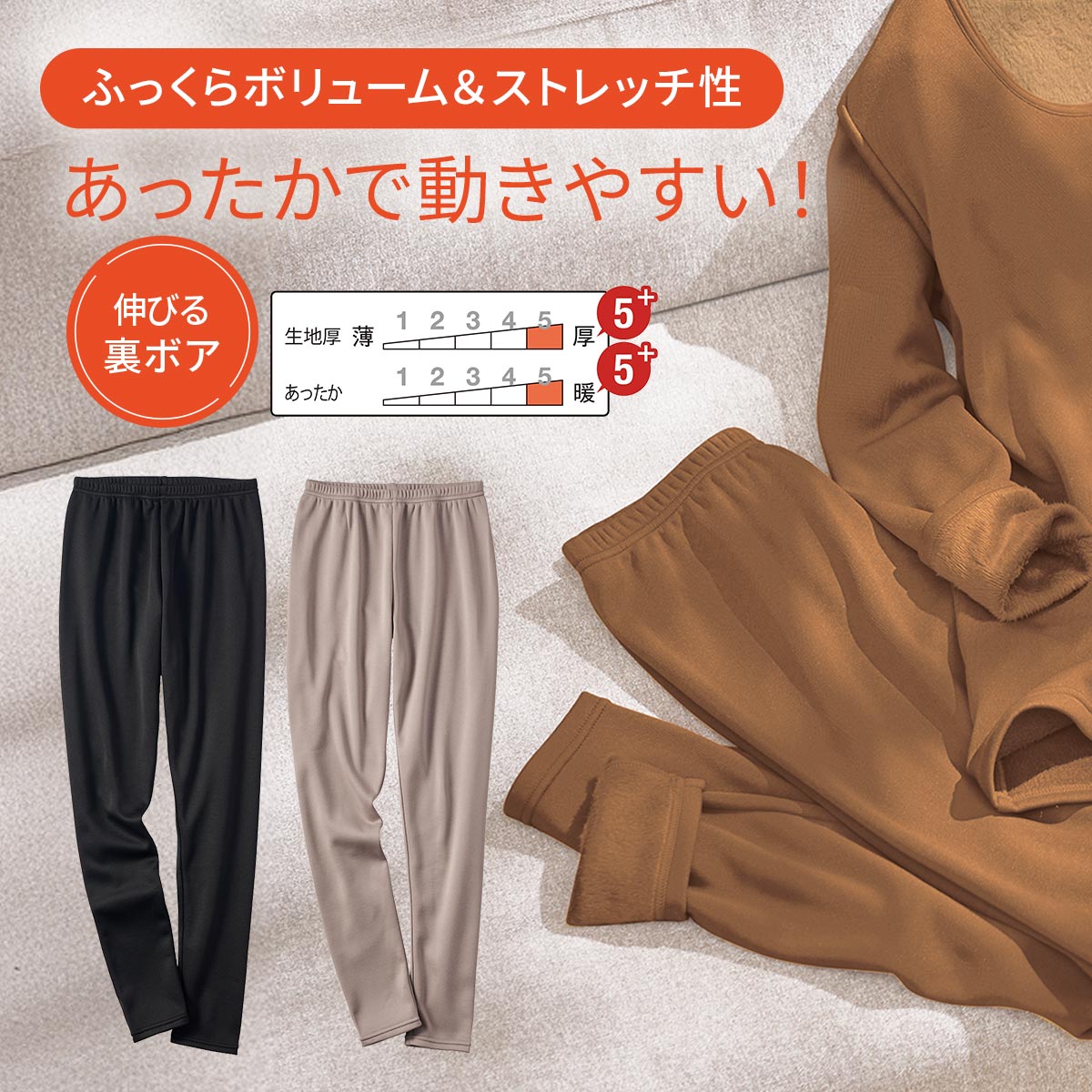 肌側は、まるで毛布みたいにあったかいボアがたっぷりで、ふわふわヌクヌク。表側はアウターのすべりが良い滑らかな肌ざわりでとっても柔らか。厚地なのによく伸びるから、アウターを重ねても動きやすくて快適!股上も程よく長めで、お腹とお尻をすっぽり包み込んでくれます。このインナーで、寒い冬を快適にお過ごしください。