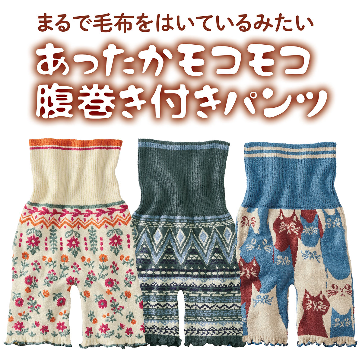 高密度で肉厚な吸湿発熱のあったかもこもこ素材で、毎年人気な腹巻付きパンツ。胸下まで、まるで毛布をはいているみたいなあたたかさ。良く伸びてリラックスタイムも快適です。今年はおしゃれな「ネコ柄」と可愛らしい「ボタニカル柄」、使いやすい「ボーダー柄」の3柄展開。節電対策にもおすすめです。