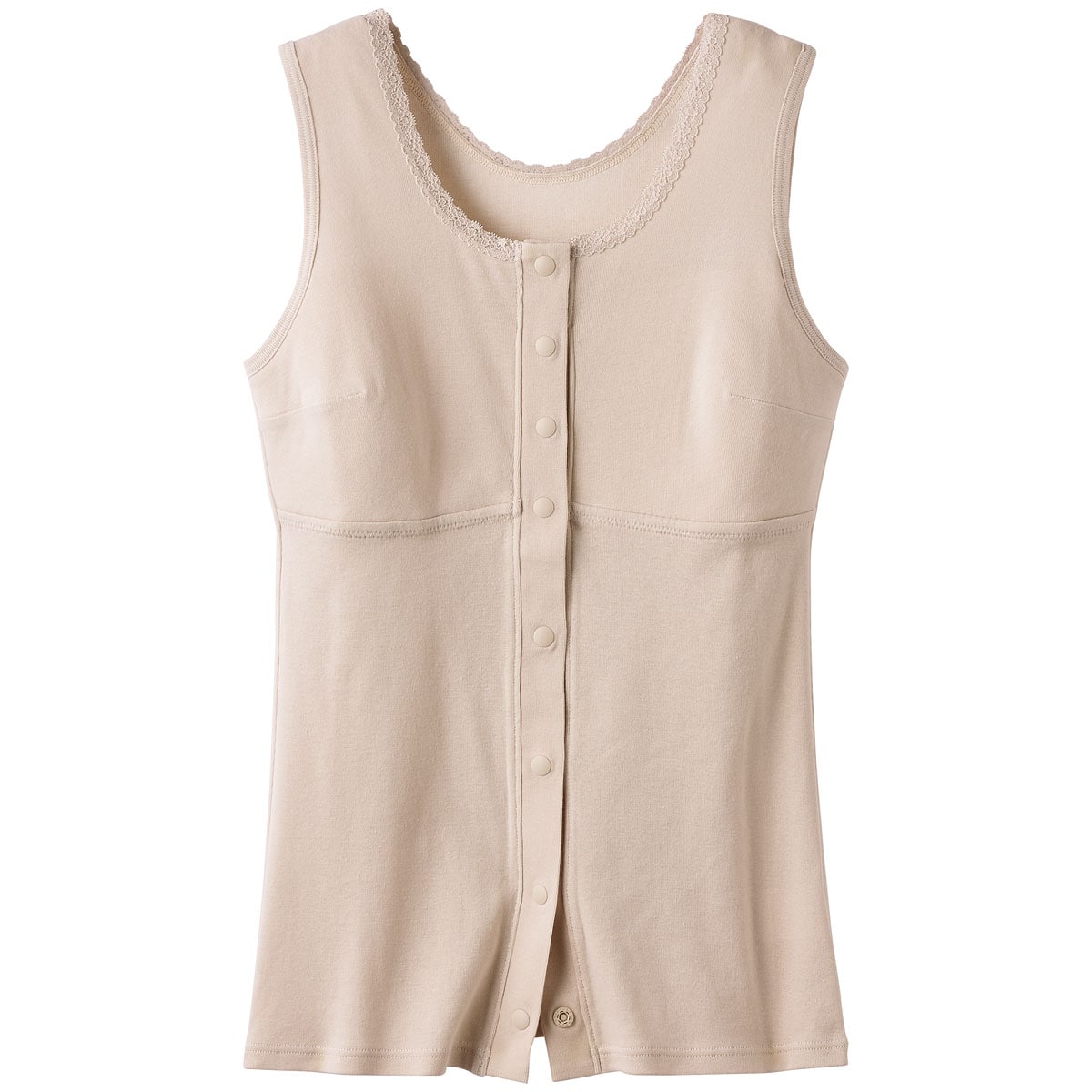 フロントがスナップボタン仕様で脱ぎ着がしやすい、やさしい着心地の綿100%ソフトカップ付きノースリーブ