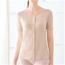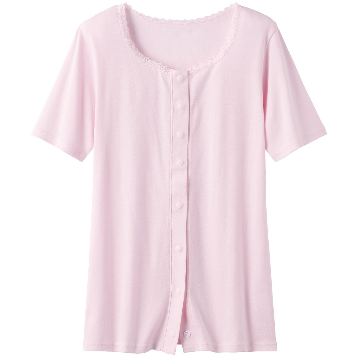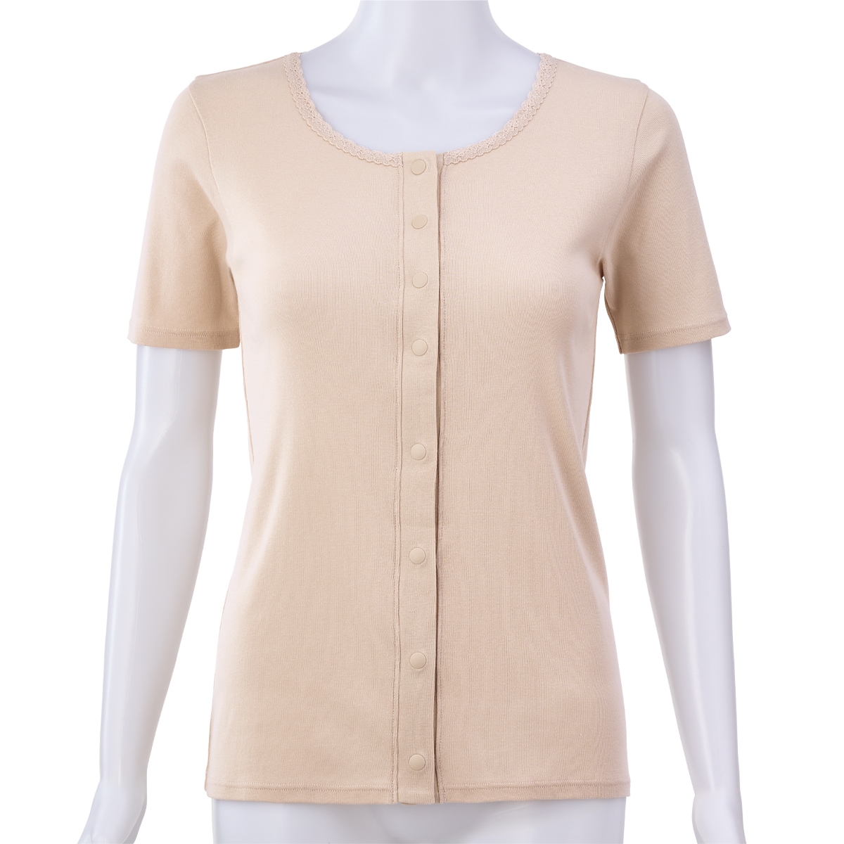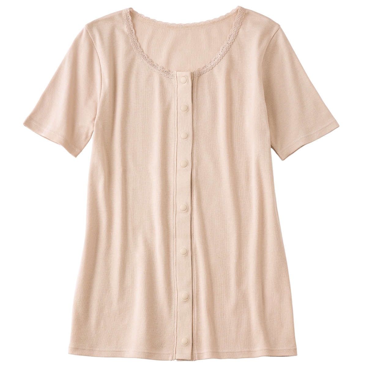 腕が上がりにくい方や、入院・通院時にも便利、フロントがスナップボタンで全開できて脱ぎ着がラクな3分袖インナー。