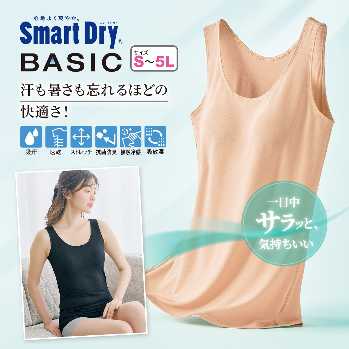 【Smart Dry®BASICシリーズ】汗も暑さも忘れるほどの快適さ!接触冷感、吸汗・速乾など機能満載。スマートドライ®BASICシリーズに1枚で着られてラクなカップ付きノースリーブが新登場!