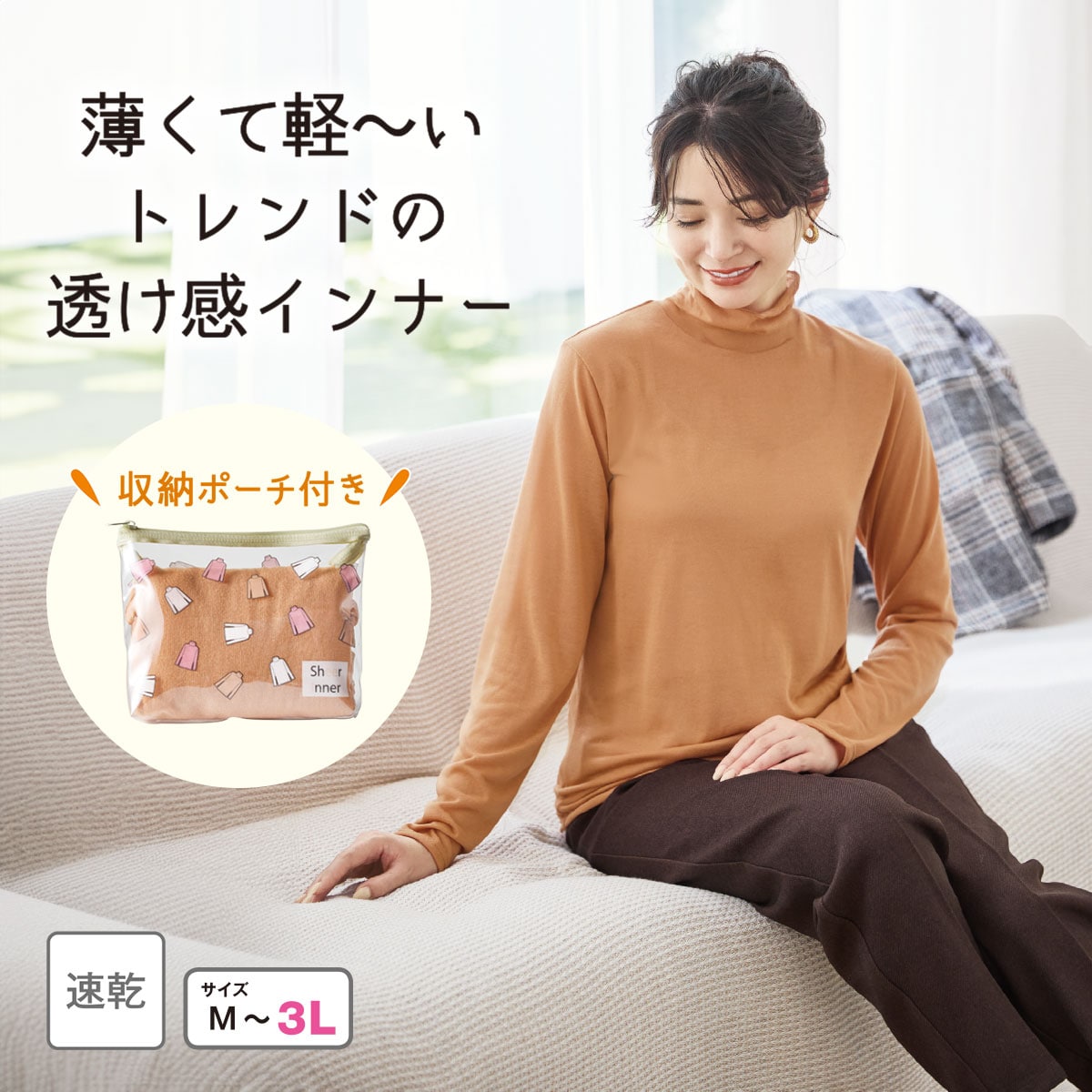 薄くて軽~い、さりげない透け感がトレンドのタートルネックインナー。乾きも早く、旅行にも便利な収納ポーチ付き。