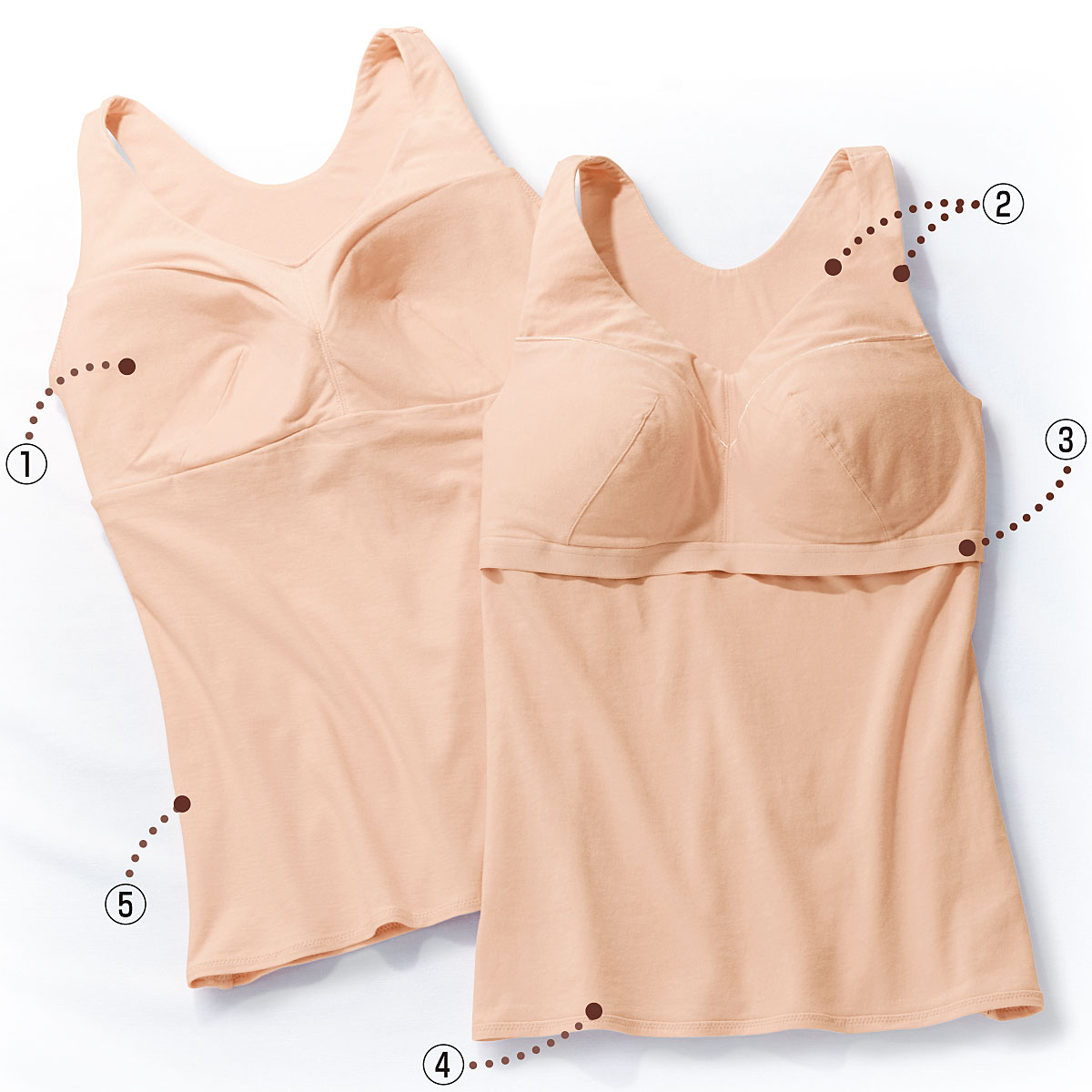(右から)オモテ側、肌側(1)カップ肌側は縫い目レス (2)ネックラインとアームホールはテープ内蔵で肌当たりもやさしく安定感も◎ (3)アンダーゴムは表に付けて肌当たりを軽減 (4))裾の縫いしろを表に出して肌にやさしく (5)脇の縫い目が肌に当たらない袋縫い仕様