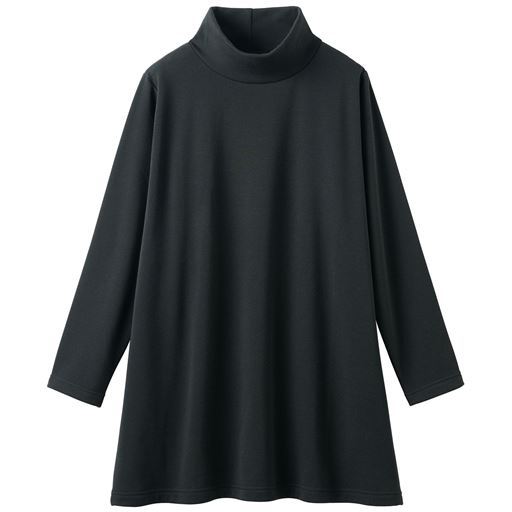 伸縮性がよく動きやすい。1枚でおしゃれ見えするシンプルなデザイン。首元あったかハイネック&おしりまで包む、ゆったりAラインのチュニック長袖。