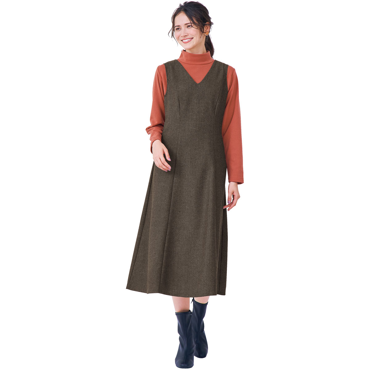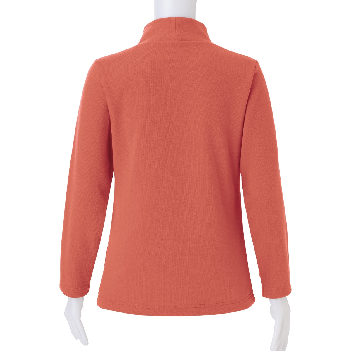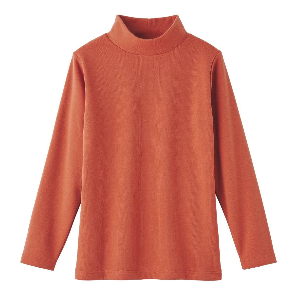 毛布を着ているようなあたたかさが心地いい、「裏ボア」トップス。重ね着にも便利なコンパクトなシルエットのハイネックタイプ。ダルオレンジ 着用例