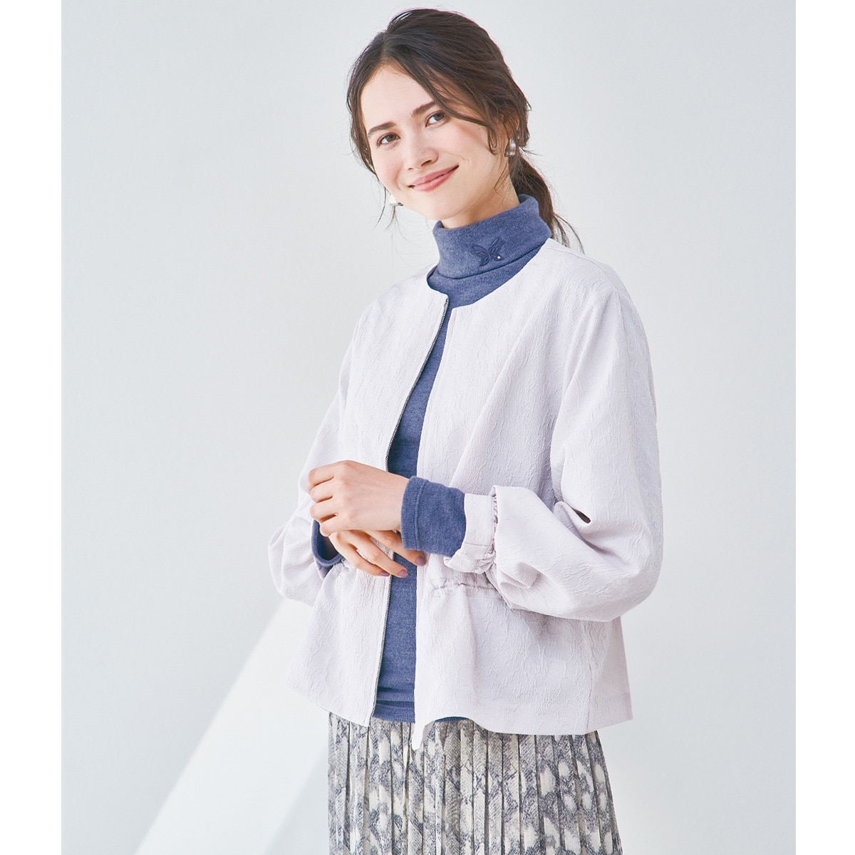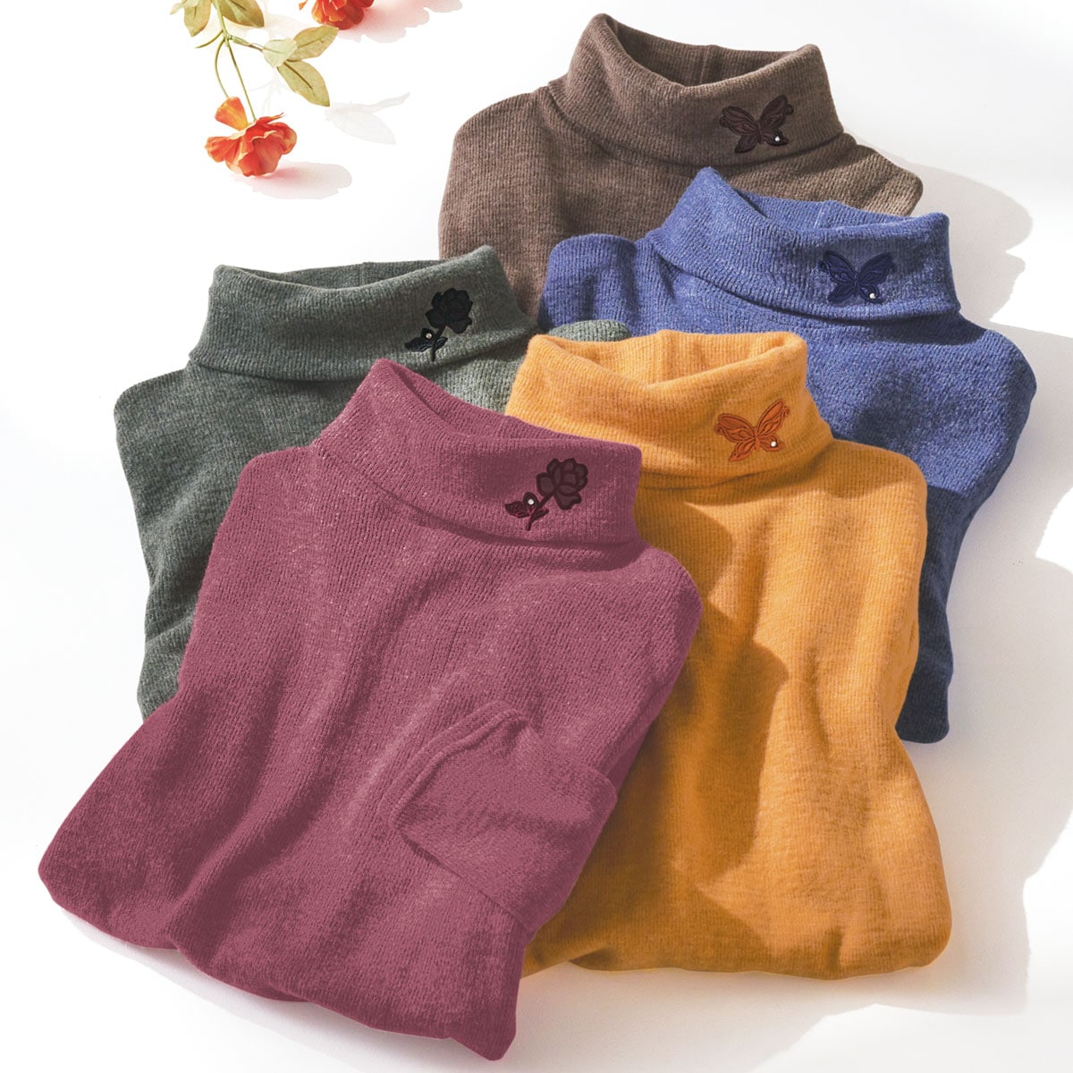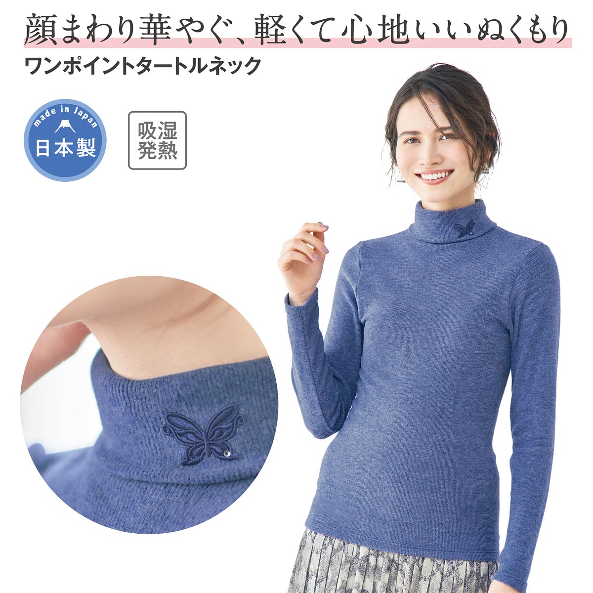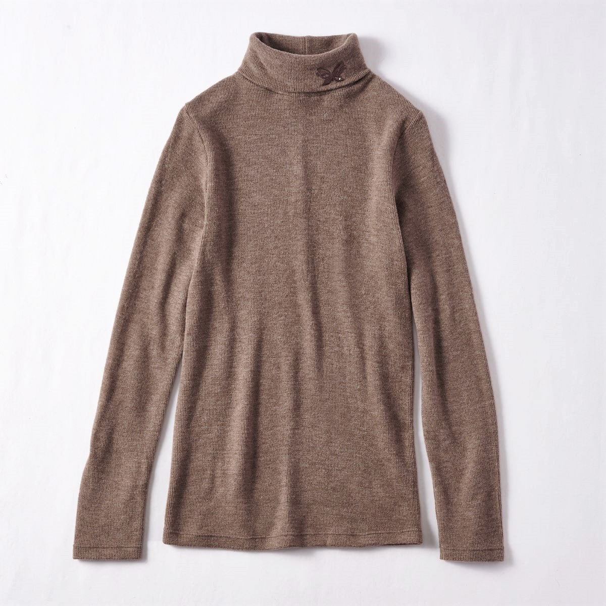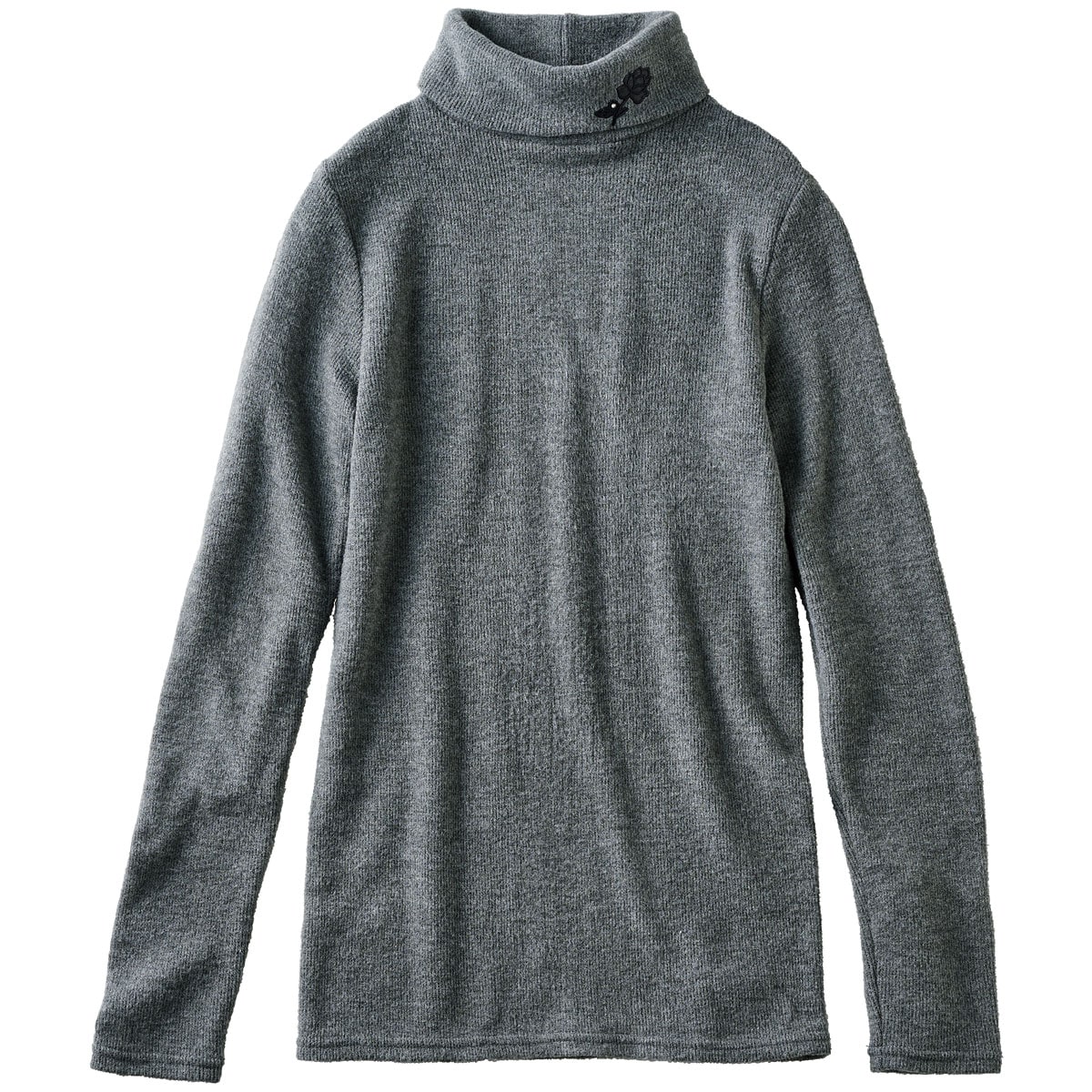 タートルネックの折り返した衿に、ラインストーンを施した刺しゅうモチーフをあしらいました。アクセいらずで、衿元に女性らしいアクセントをプラスしてくれます。生地は両面を起毛させたふんわり柔らかで軽やかな風合い。体から発散される水分を吸着して発熱する吸湿発熱機能があるから、心地よいぬくもりが得られます。