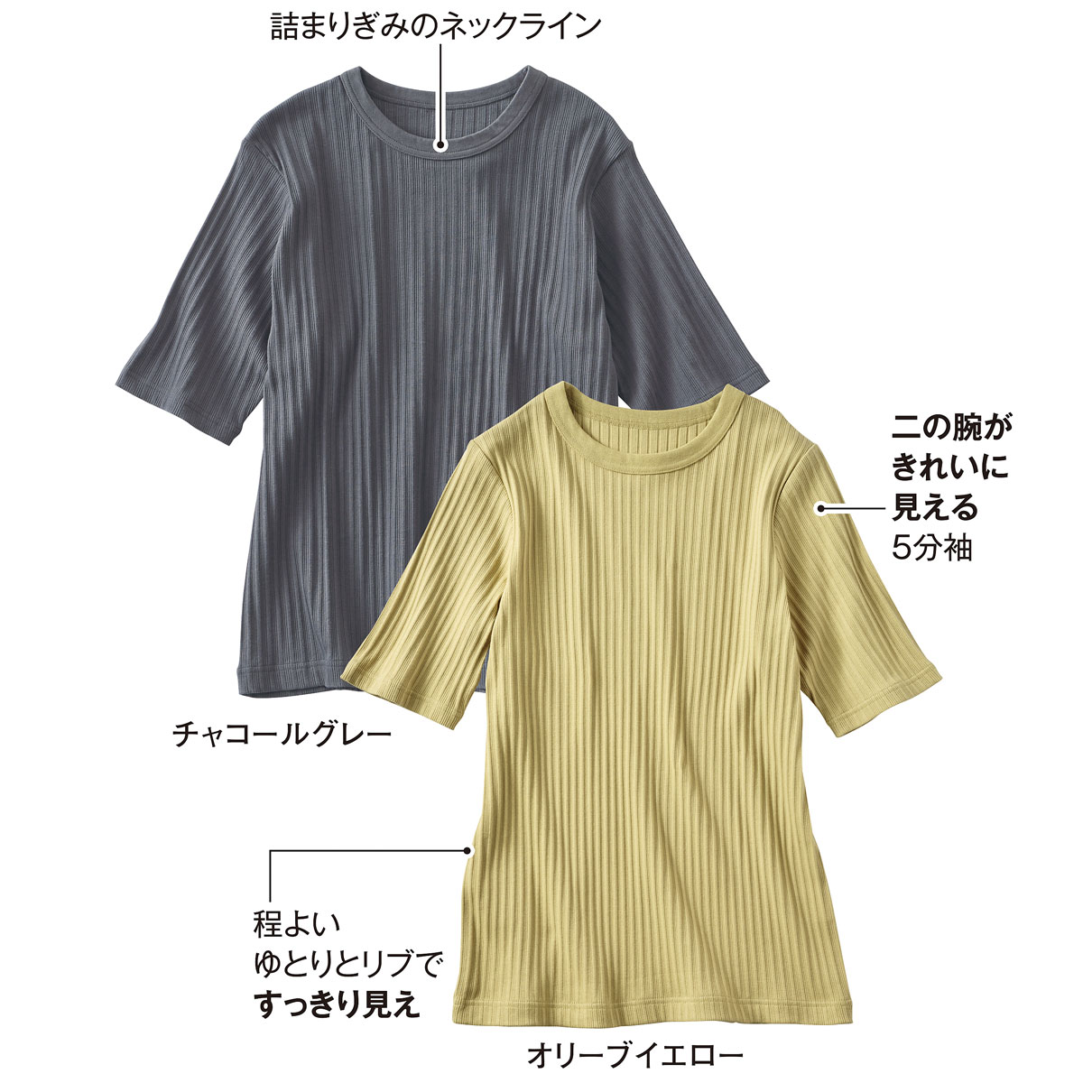 伸縮性に優れたリブ素材で、スッキリ細見えするきれいめTシャツ。あき過ぎないネックラインと二の腕がきれいに見える5分袖で、気になる部分をカバー。程よいゆとりでコンパクトなシルエットだから、ジャケットなどのインにもおすすめ。衿元は別布使いで、よれにくくきれいが続く。