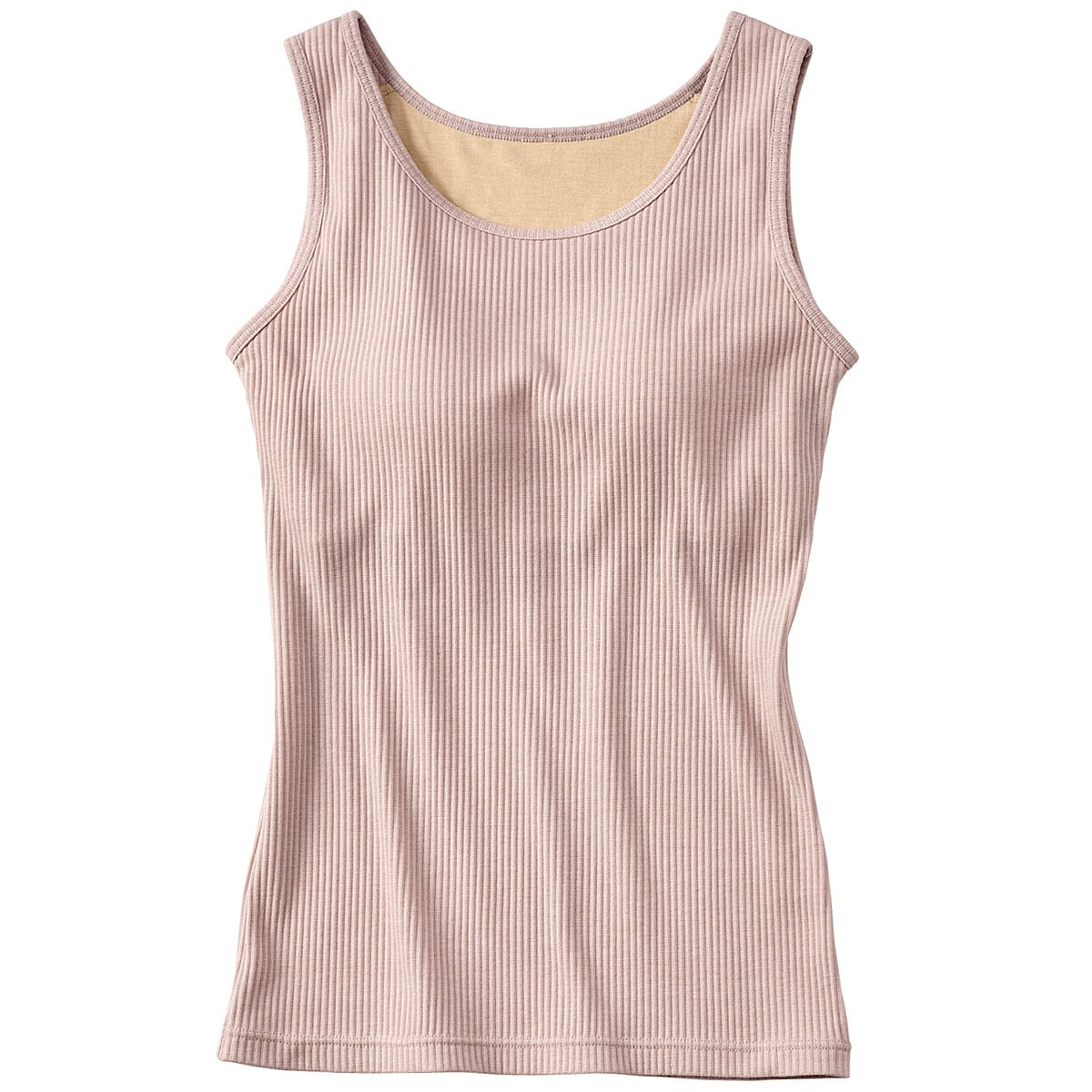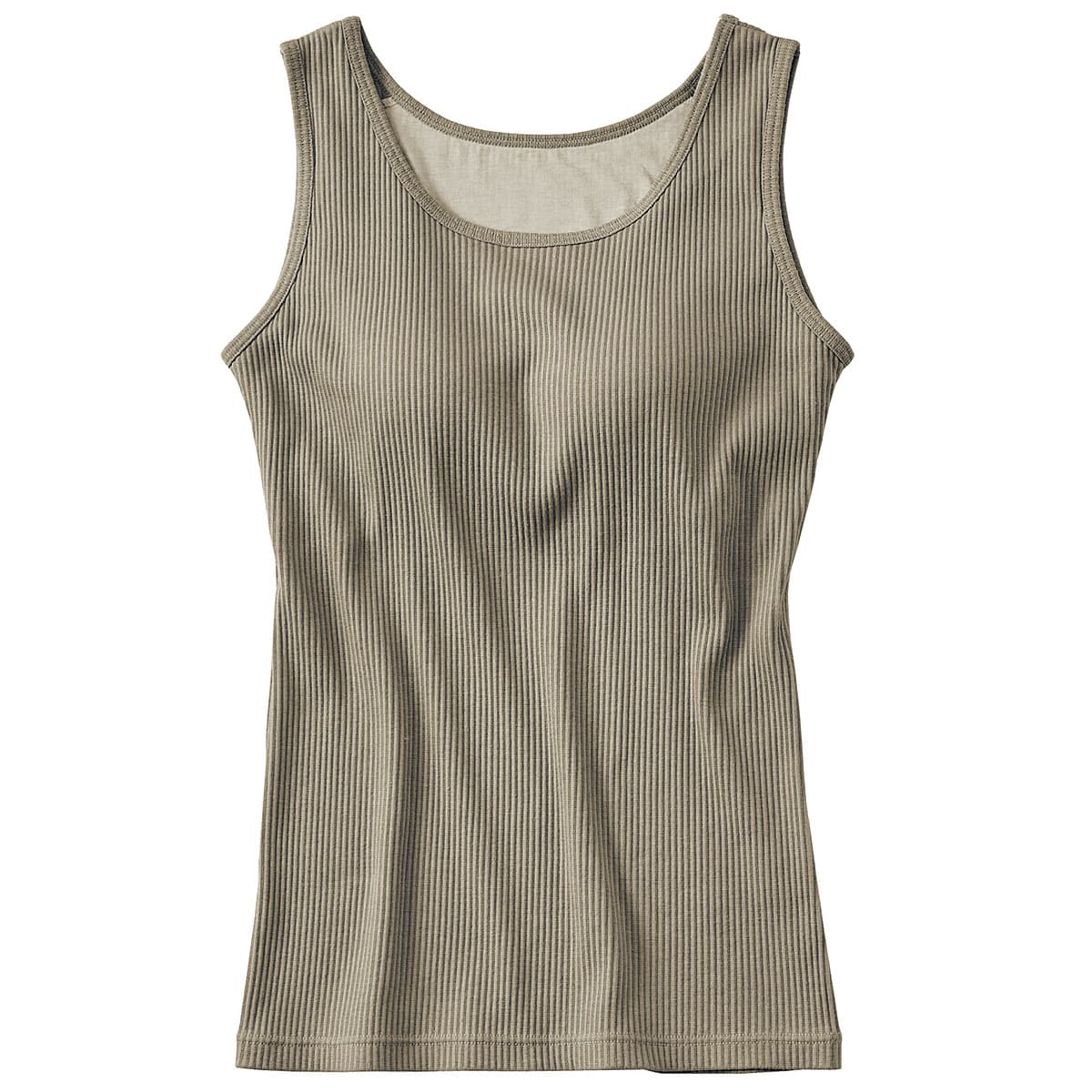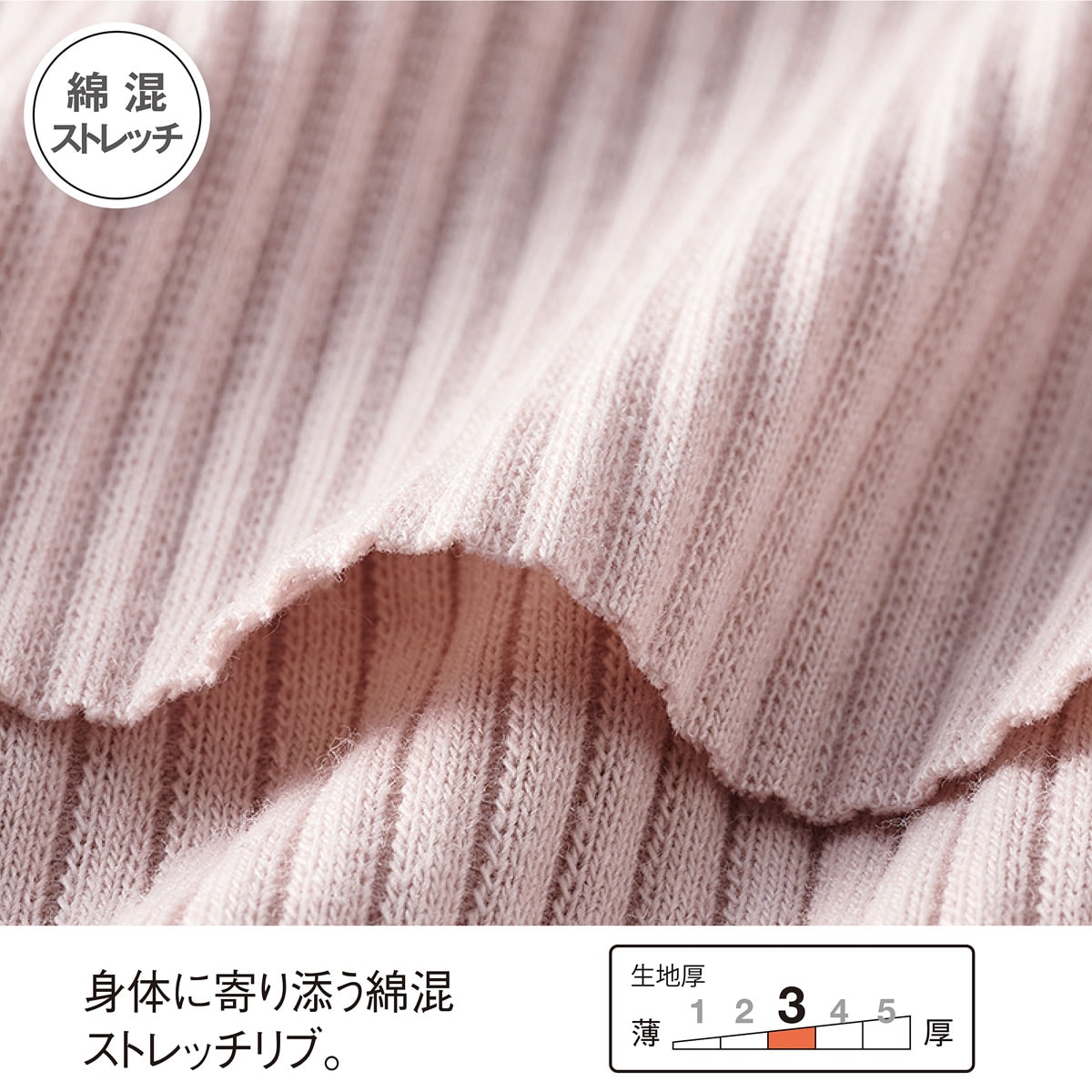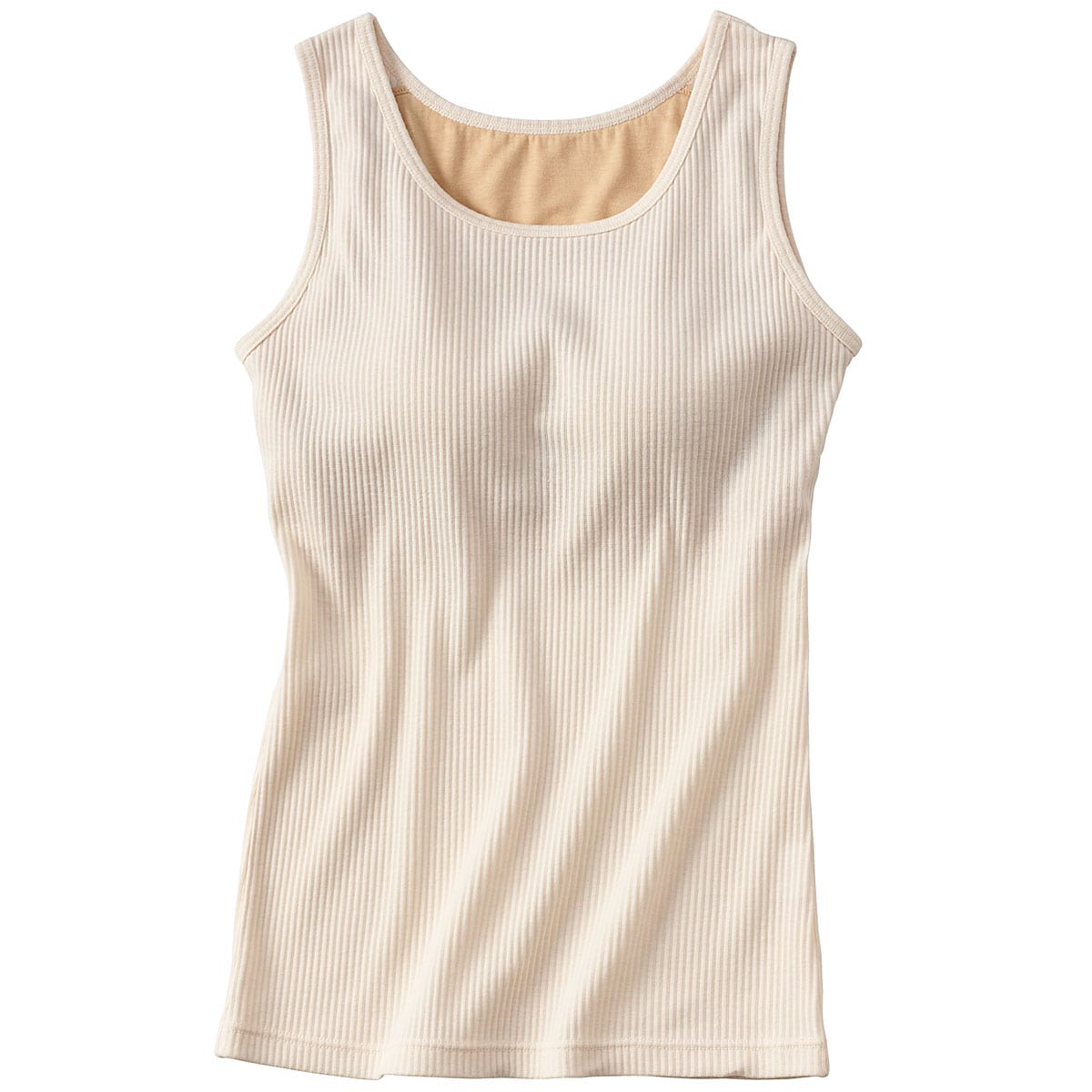 脇や衿ぐりが開きすぎず、身体に寄り添う綿混リブ素材でアウターにも馴染むデザイン。カップ付きだからブラいらずで、1枚ですっきり快適に着用いただけます。