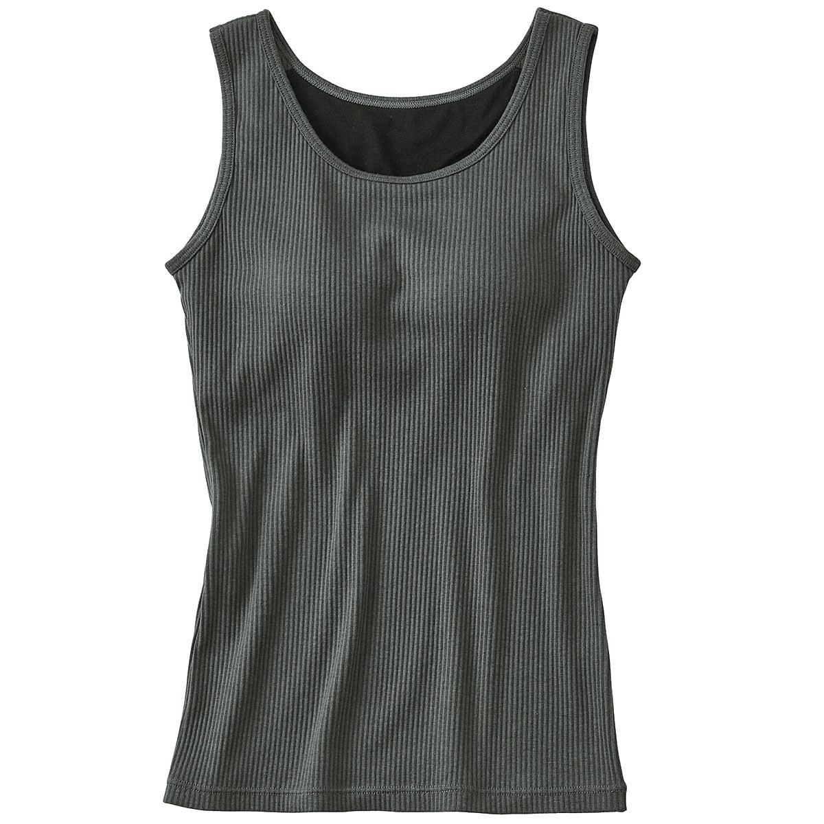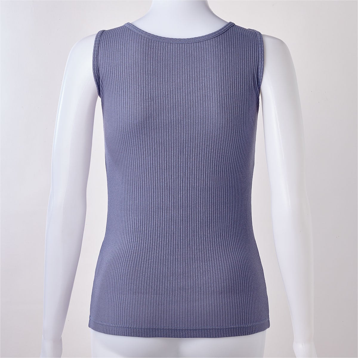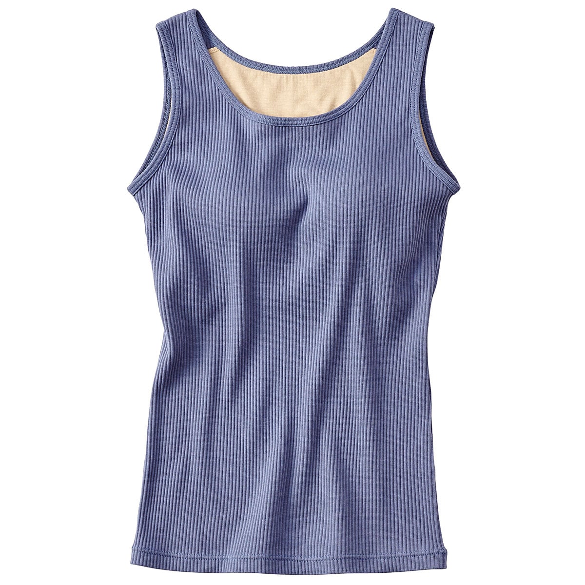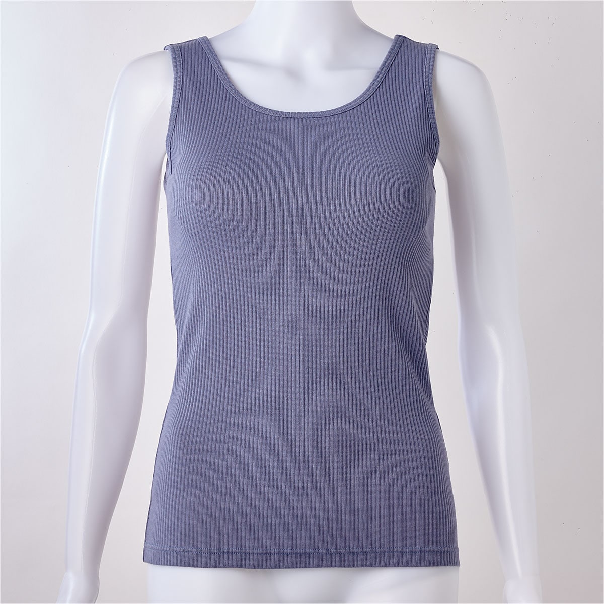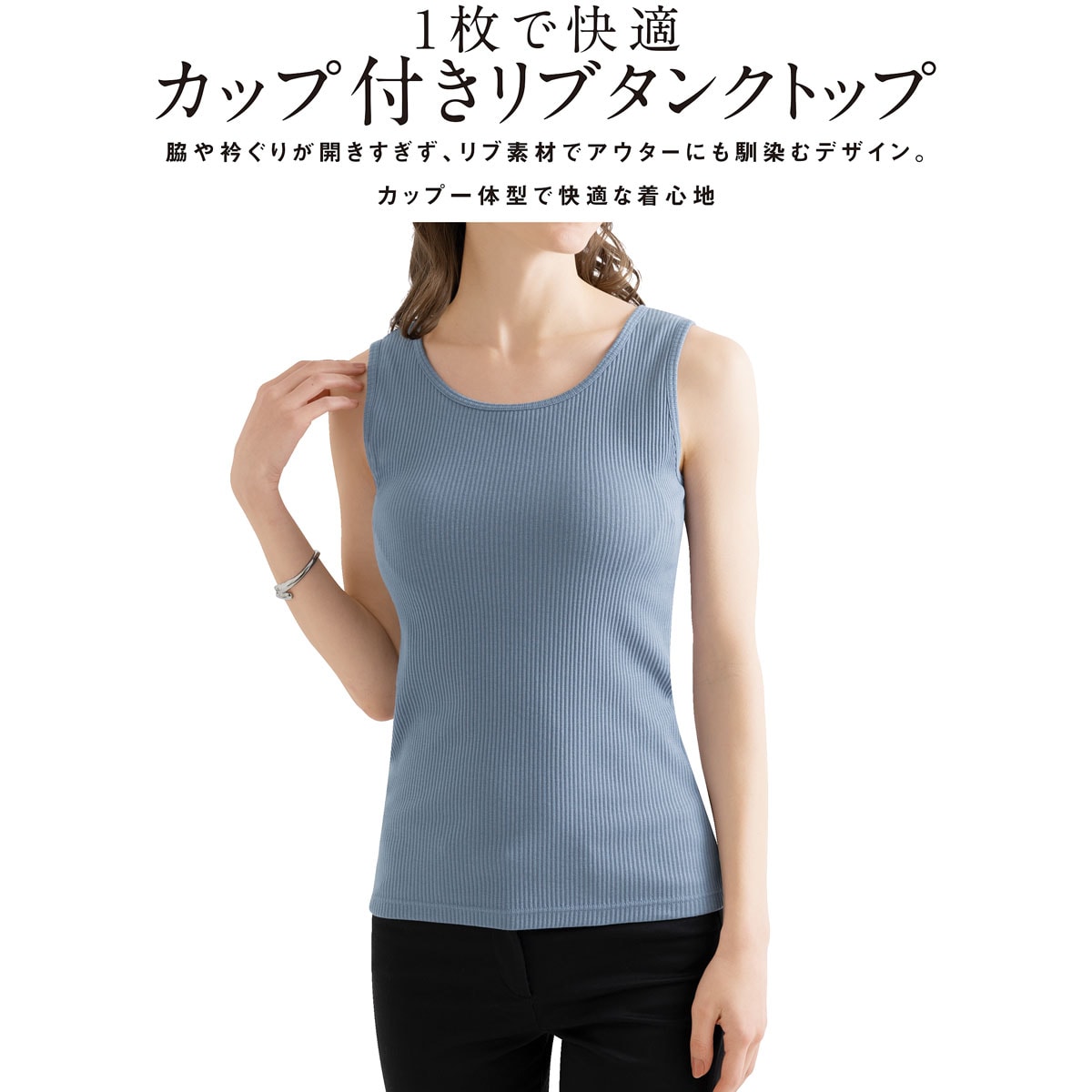 グレイッシュブルー1枚あると便利!コーデに大活躍するリブ素材のカップ付きタンクトップ。