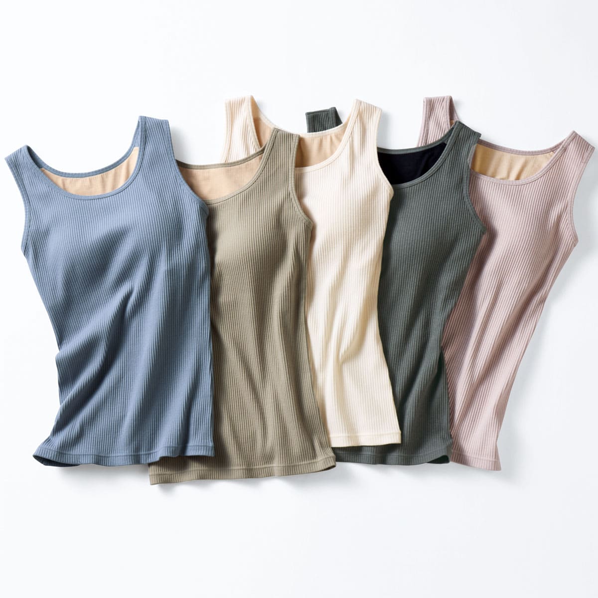 脇や衿ぐりが開きすぎず、身体に寄り添う綿混リブ素材でアウターにも馴染むデザイン。カップ付きだからブラいらずで、1枚ですっきり快適に着用いただけます。使いやすいカラーで、アウターとのコーデにも活躍します。