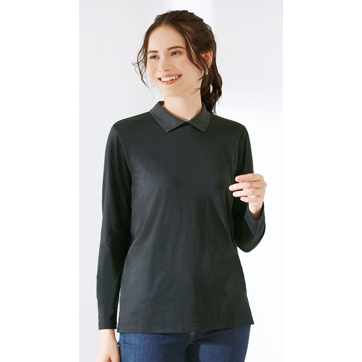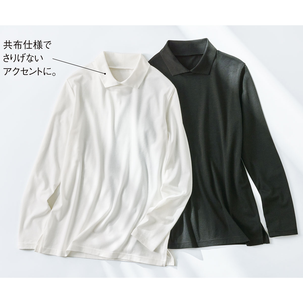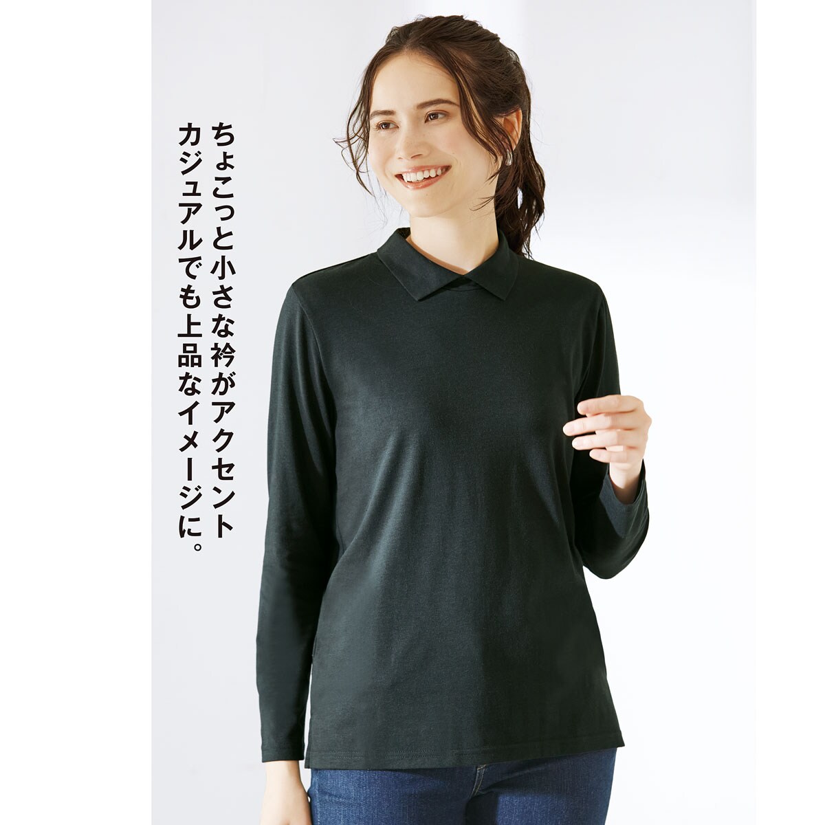共布仕様のちょこっと小さな衿がアクセント。カジュアルにもキレイめにも着こなせる、無地のシンプルなデザインの長袖インナーTシャツ。アウターとのコーデもしやすく着こなしに幅が出ます。なめらかな肌触りのストレッチ素材で着心地軽やか。両脇にスリット入りで動きやすい仕様です。