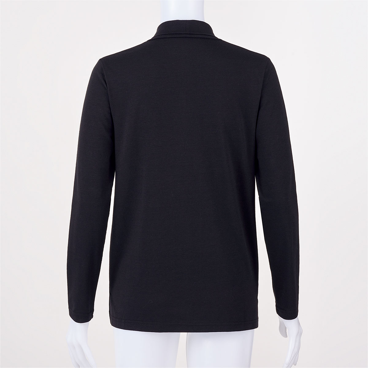 カジュアルにもキレイめにも。きちんと見えする小さめの衿が付いたTシャツ。 ブラック着用例