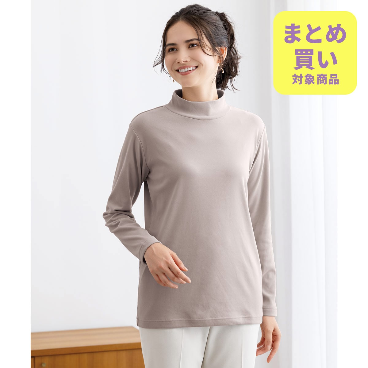 ハイネックで首もとスッキリ。レイヤードスタイルにも使いやすい、あったかTシャツ。グレージュ 着用例