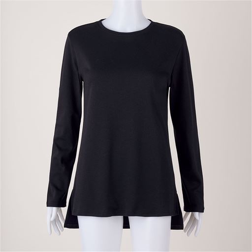 トルマリン・温泉鉱石を独自の加工剤で半永久的に結合。身体から発した熱エネルギーを吸収し再放射するため、着ぶくれせずにやさしいぬくもりが続きます。肌ざわりも動きやすさにも優れた綿混スムース素材を使用し、伸縮性もよく着心地もラク。シンプルなクルーネックと、両脇にスリットの入った前後差のある裾デザインで、すっきりとしたシルエットに。重ね着もおしゃれに。