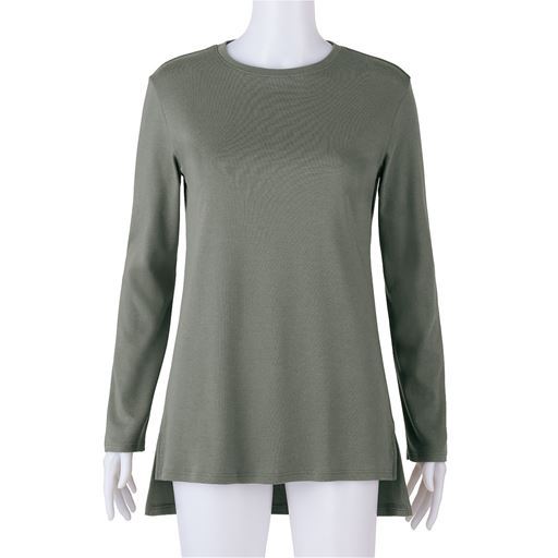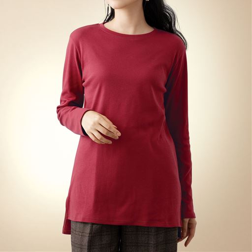 遠赤効果でやさしくあたため。着ぶくれせずにあったかが続く、クルーネックTシャツ。前後差のあるスリット入り、ヒップまでカバーする前後差のあるロング丈デザインです。 ウォームレッド着用例