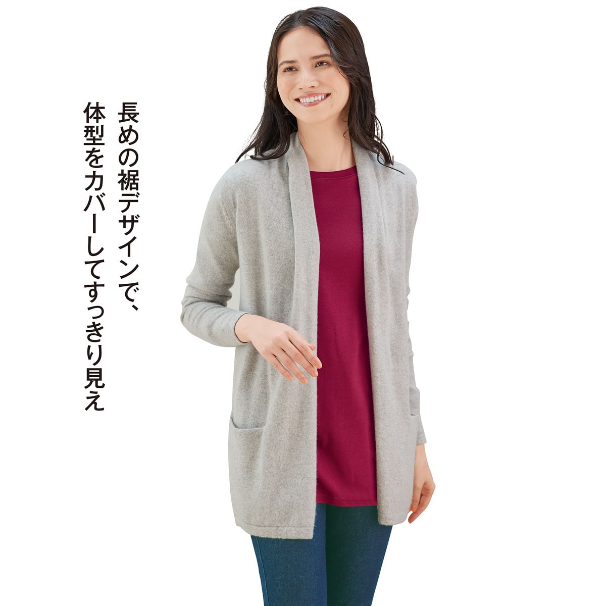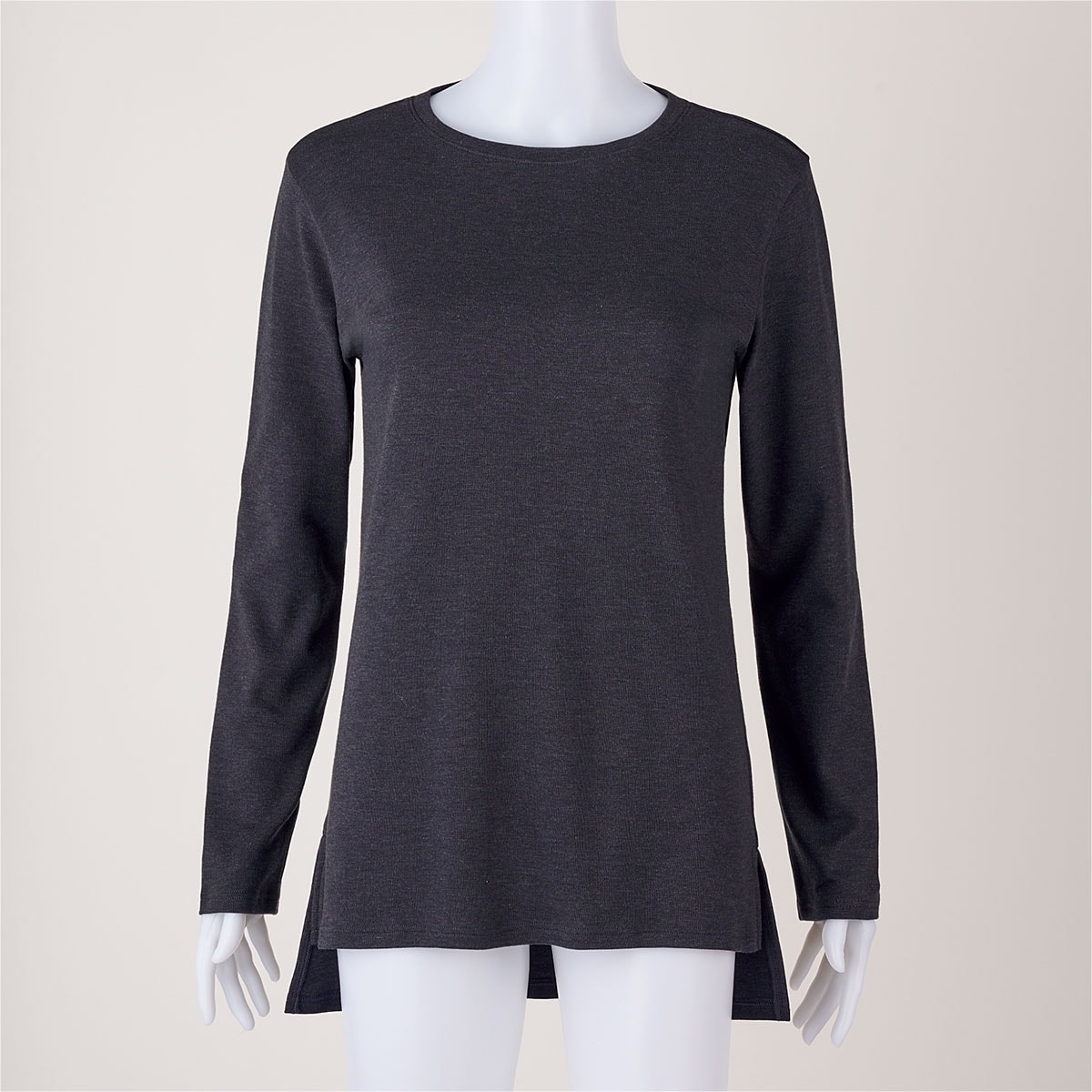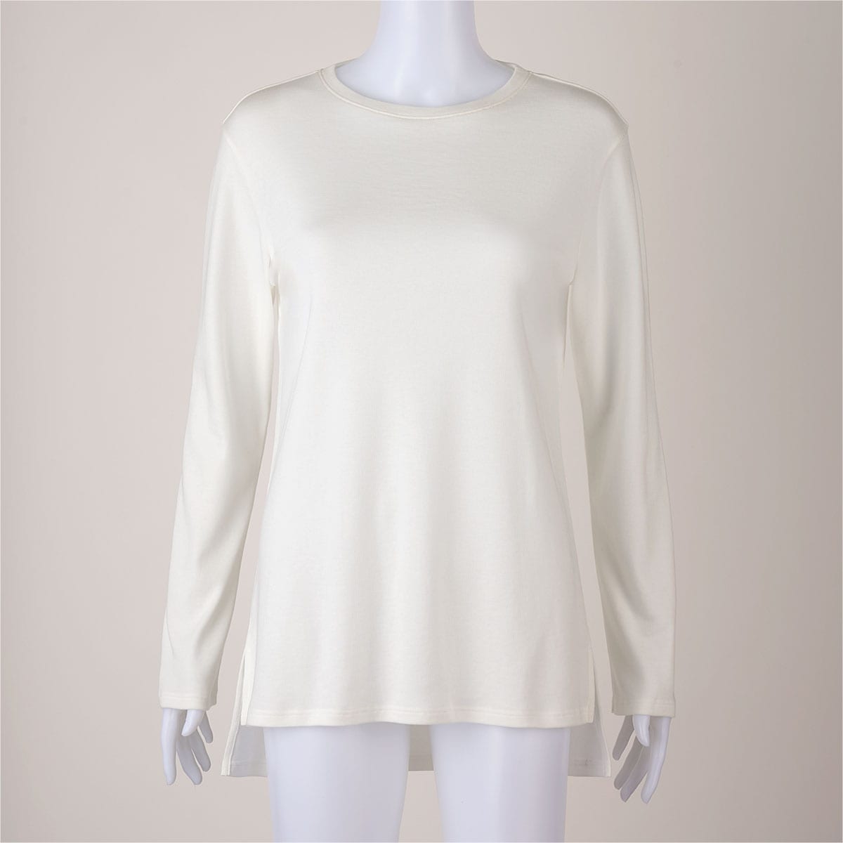 トルマリン・温泉鉱石を独自の加工剤で半永久的に結合。身体から発した熱エネルギーを吸収し再放射するため、着ぶくれせずにやさしいぬくもりが続きます。肌ざわりも動きやすさにも優れた綿混スムース素材を使用し、伸縮性もよく着心地もラク。シンプルなクルーネックと、両脇にスリットの入った前後差のある裾デザインで、すっきりとしたシルエットに。重ね着もおしゃれに。