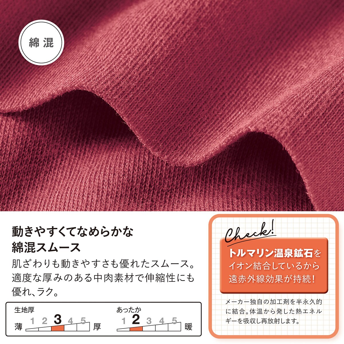 動きやすくてなめらかな綿混スムース。肌ざわりも動きやすさも優れたスムース素材を使用。適度な厚みのある中肉素材で伸縮性にも優れ、着心地もラク。