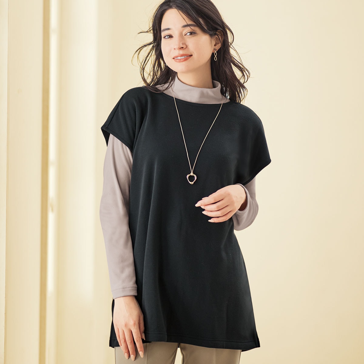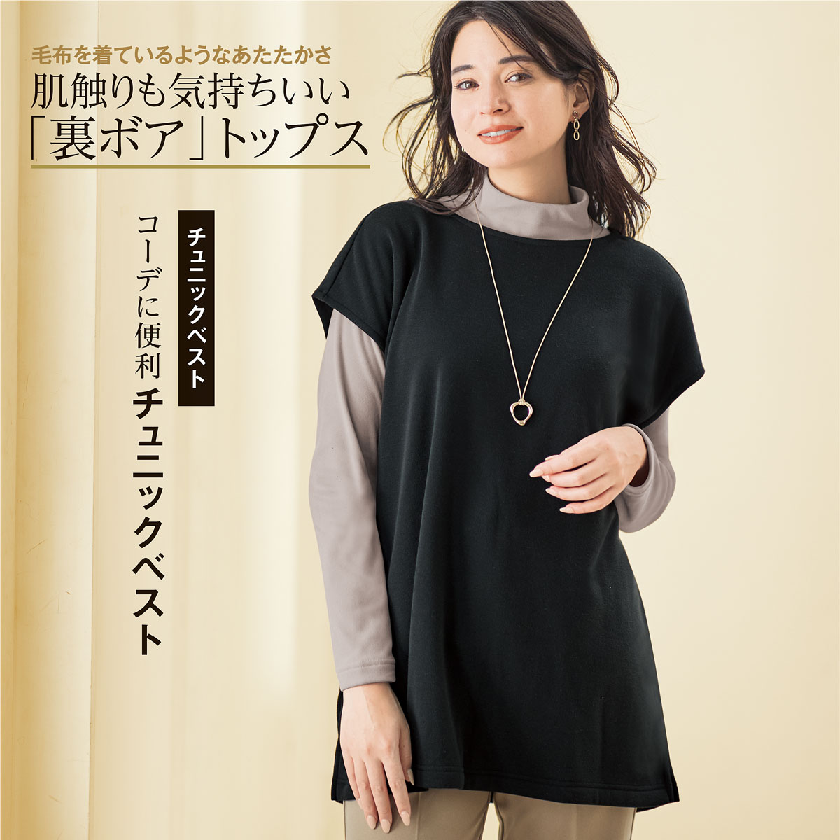 毛布を着ているようなあたたかさが心地いい、「裏ボア」のチュニックベスト。ブラック 着用例 ※インにはUP-978「マシュマロみたいなフリースハイネックTシャツ」グレージュを着用しています(別売)。
