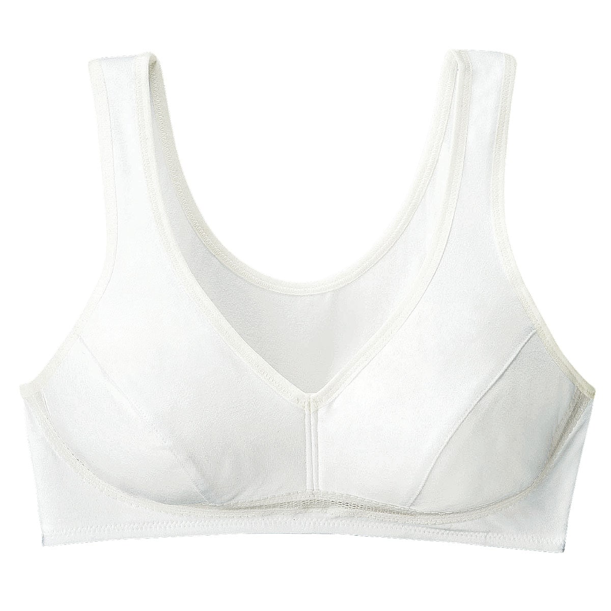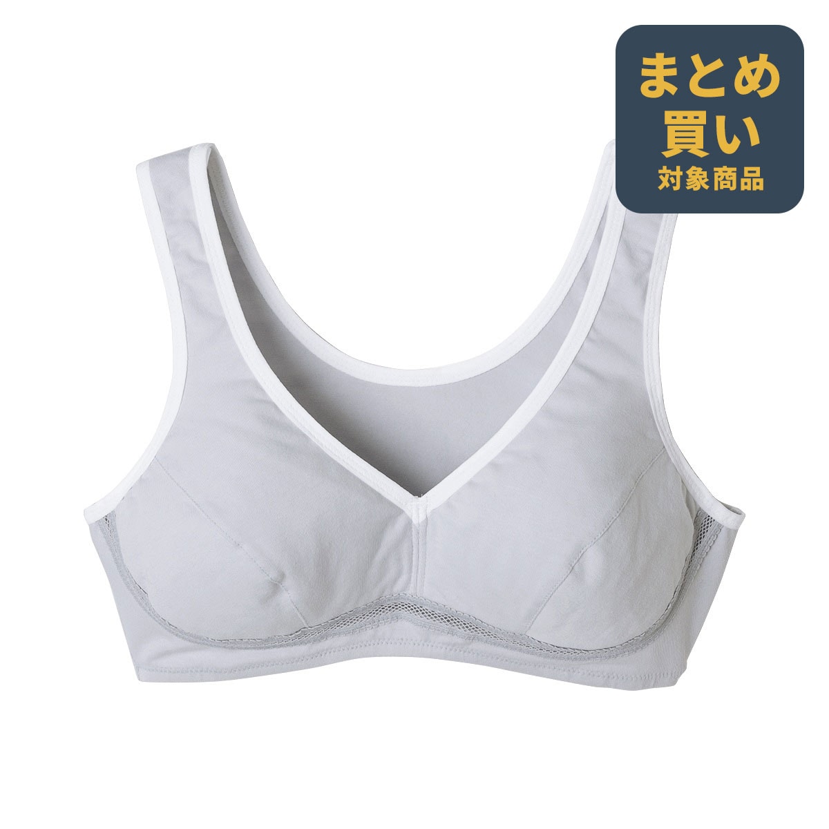 運動すると意外に胸にも汗をかくもの。バストがムレて気持ち悪い時には風通しのいいブラがおすすめ。カップ周りがメッシュ仕様で通気性バツグン。汗をかいてもムレにくい。アンダーゴムは生地でくるんでいるから肌あたりもやさしい。ワイヤーなしでくい込む痛みもなく、つけ心地良い綿混素材。ライトグレーが新登場!パイピングが今っぽくてスポーティーさをプラスしてくれるよ