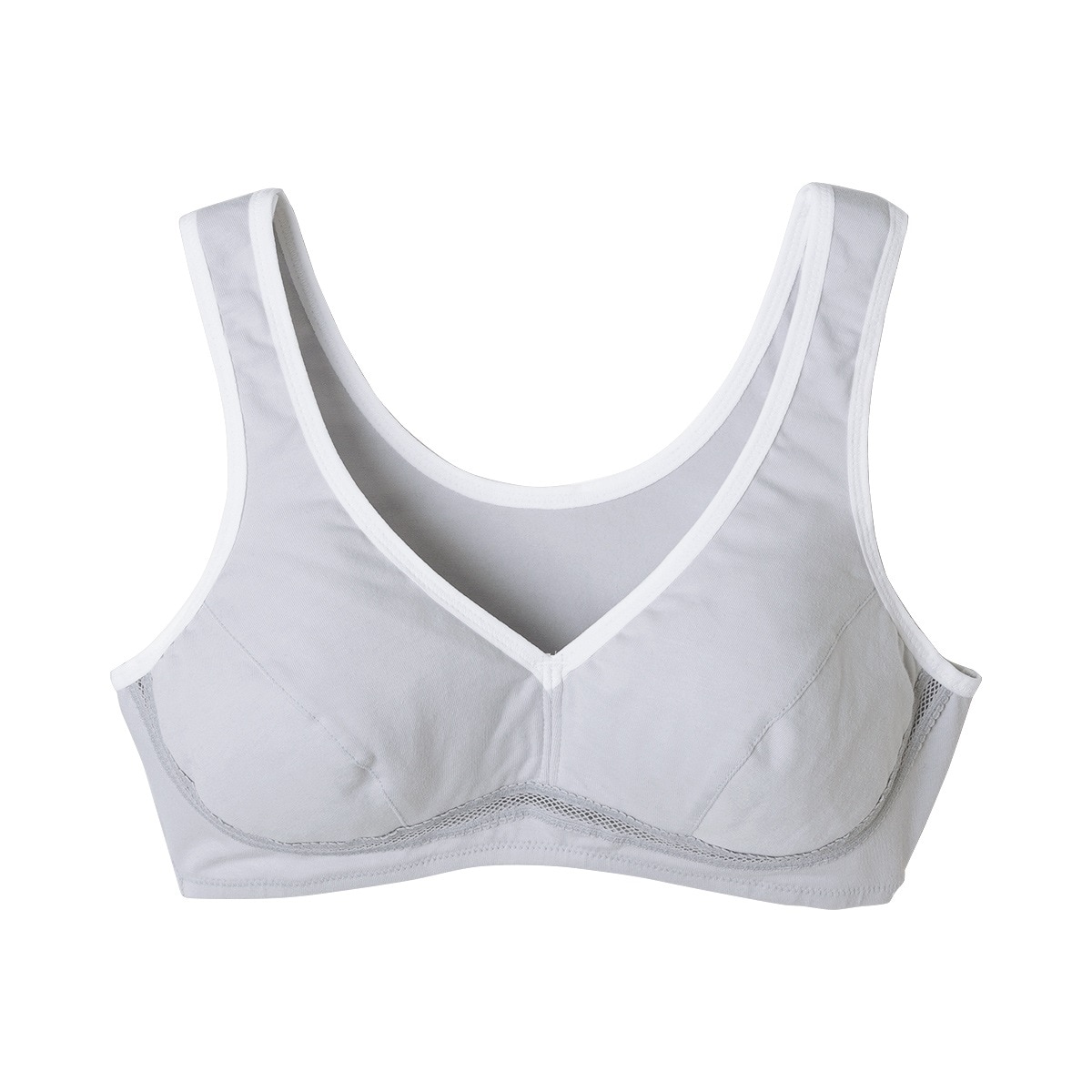 運動すると意外に胸にも汗をかくもの。バストがムレて気持ち悪い時には風通しのいいブラがおすすめ。カップ周りがメッシュ仕様で通気性バツグン。汗をかいてもムレにくい。アンダーゴムは生地でくるんでいるから肌あたりもやさしい。ワイヤーなしでくい込む痛みもなく、つけ心地良い綿混素材。ライトグレーが新登場!パイピングが今っぽくてスポーティーさをプラスしてくれるよ