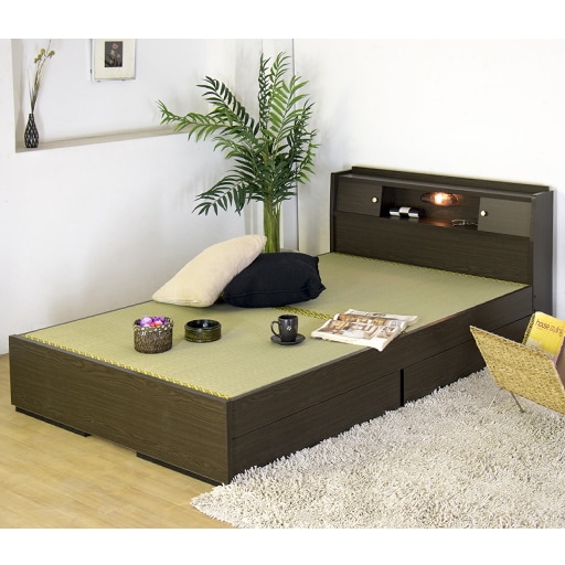 本い草の香りでリラックスしてお休みいただける本い草の畳ベッド。ヘッドボードは便利な照明と引出し付き。使い勝手も良好です。日本製のフレームで末永くお使いいただけます。