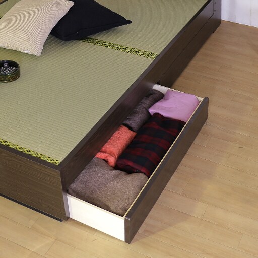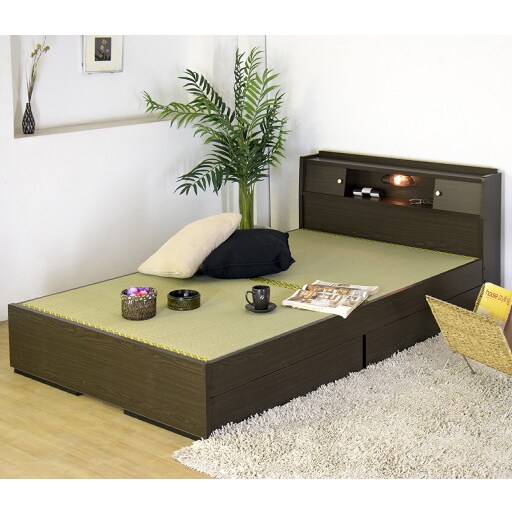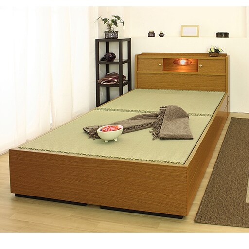本い草の香りでリラックスしてお休みいただける本い草の畳ベッド。ヘッドボードは便利な照明と引出し付き。使い勝手も良好です。日本製のフレームで末永くお使いいただけます。