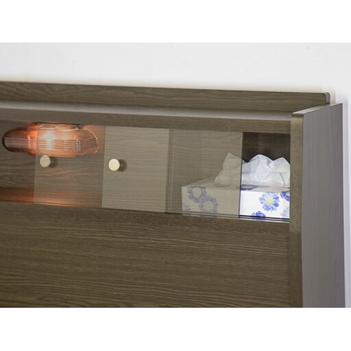 ダークブラウン セミダブルヘッドボードには棚、照明が付いています。