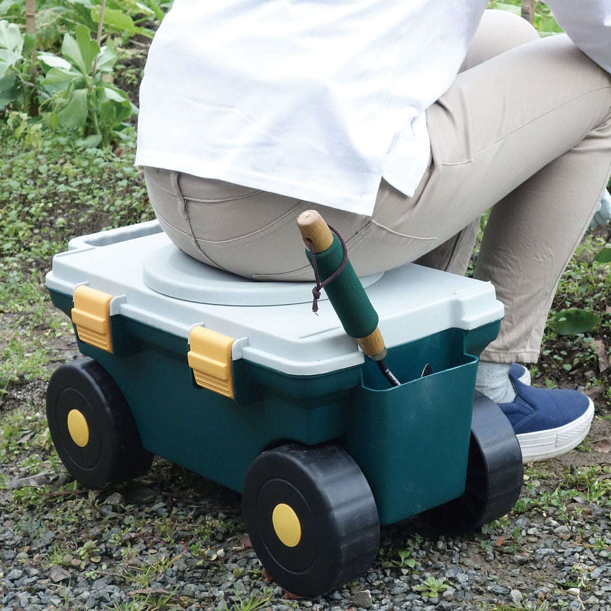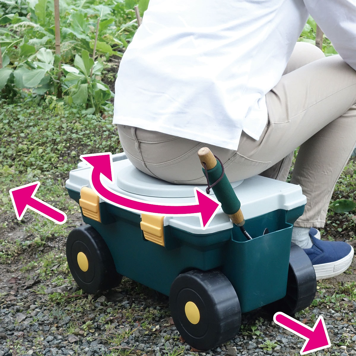 座面部の回転盤は360度自由に回転。大きな車輪で横移動、回転盤で左右に動くので、座ったままの作業も自由自在のガーデニングカート。
